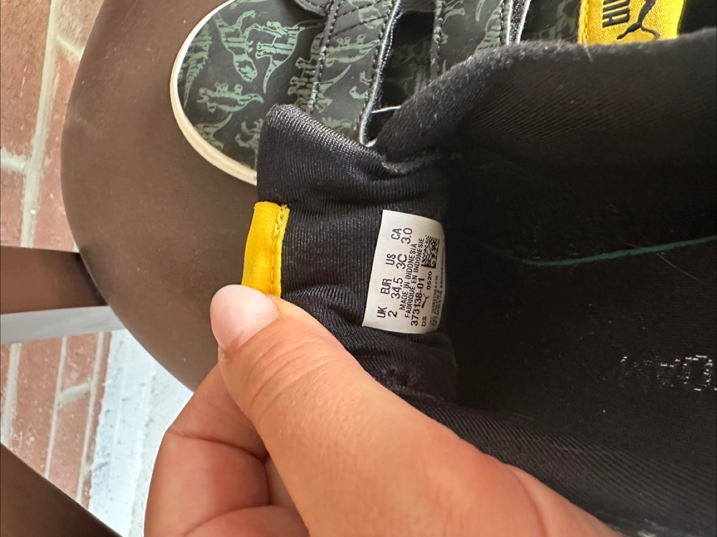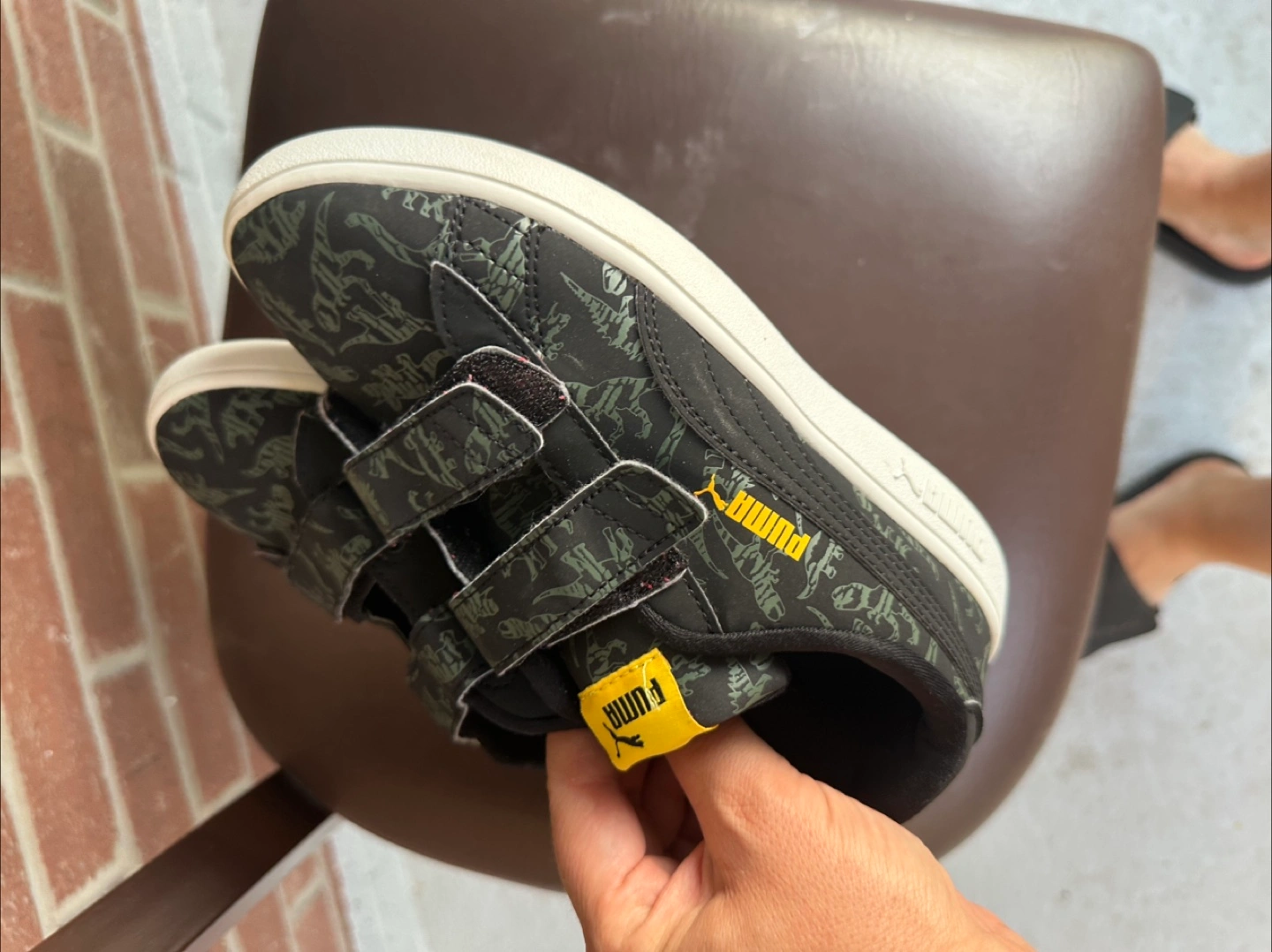 Selling a pair of Puma Smash V2 Dino V kids sneakers. They're black with a cool dinosaur pattern! The size is US 3. Great for your little one!