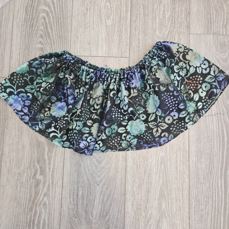 This is a cute lambada skirt with a floral design in shades of blue and black! It's in okay condition and would be perfect for a casual outing or a fun night out. The material feels soft and comfortable, making it a great addition to your wardrobe!