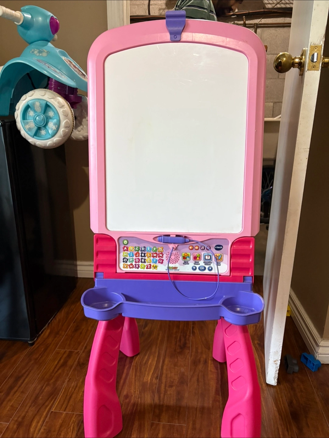 Spruce up your little one's learning space with this VTech Magic Fun Learning Easel! It features a whiteboard for creative drawing, and a chalkboard for classic fun, and interactive learning games. The easel is in used condition, perfect for hours of educational entertainment.