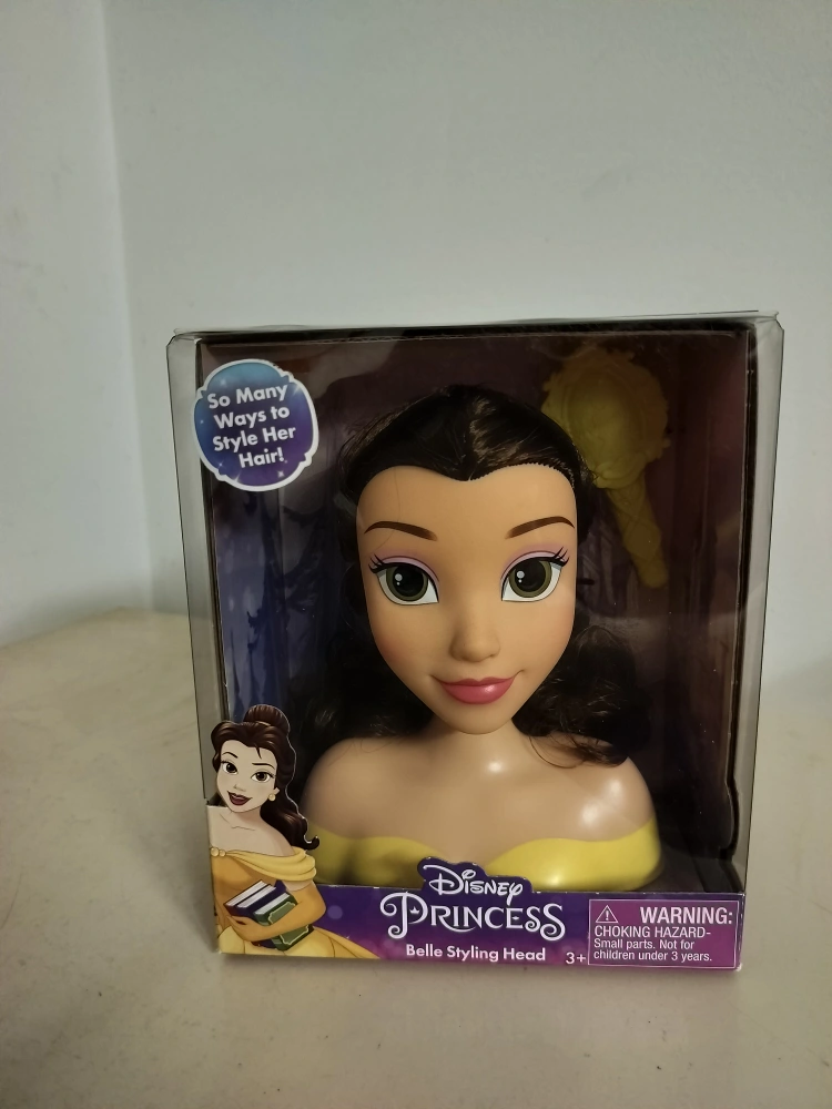 Get ready to style Belle's hair with this fun styling head! It includes one styling head and a brush, so you can create all sorts of amazing looks. The box shows 'So Many Ways to Style Her Hair!'