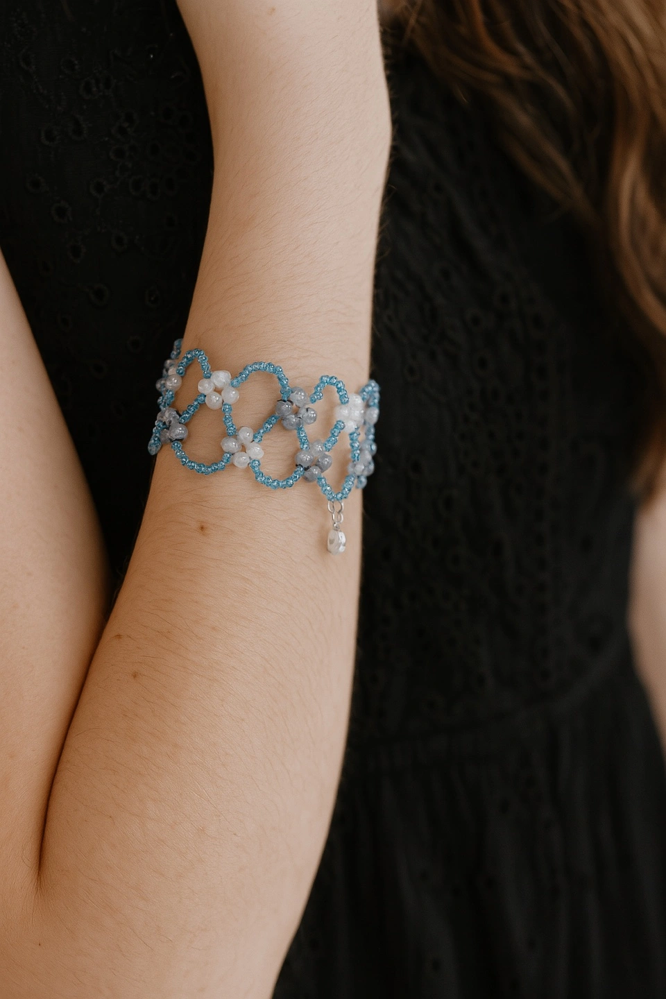 Selling a cute handmade beaded bracelet! It features a lovely combination of blue, white, and grey beads arranged in a floral pattern. Perfect for adding a touch of charm to any outfit