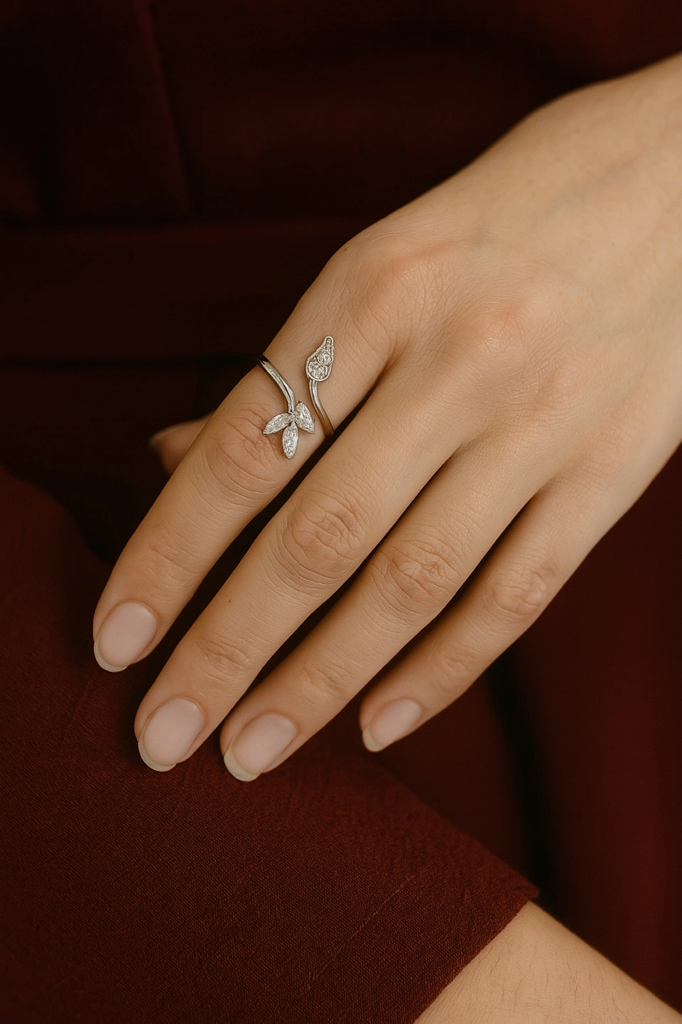 Selling a cute adjustable ring with a silver tone finish. It features a leaf design with clear stones, and a teardrop accent also with clear stones. Perfect for adding a touch of sparkle to any outfit!