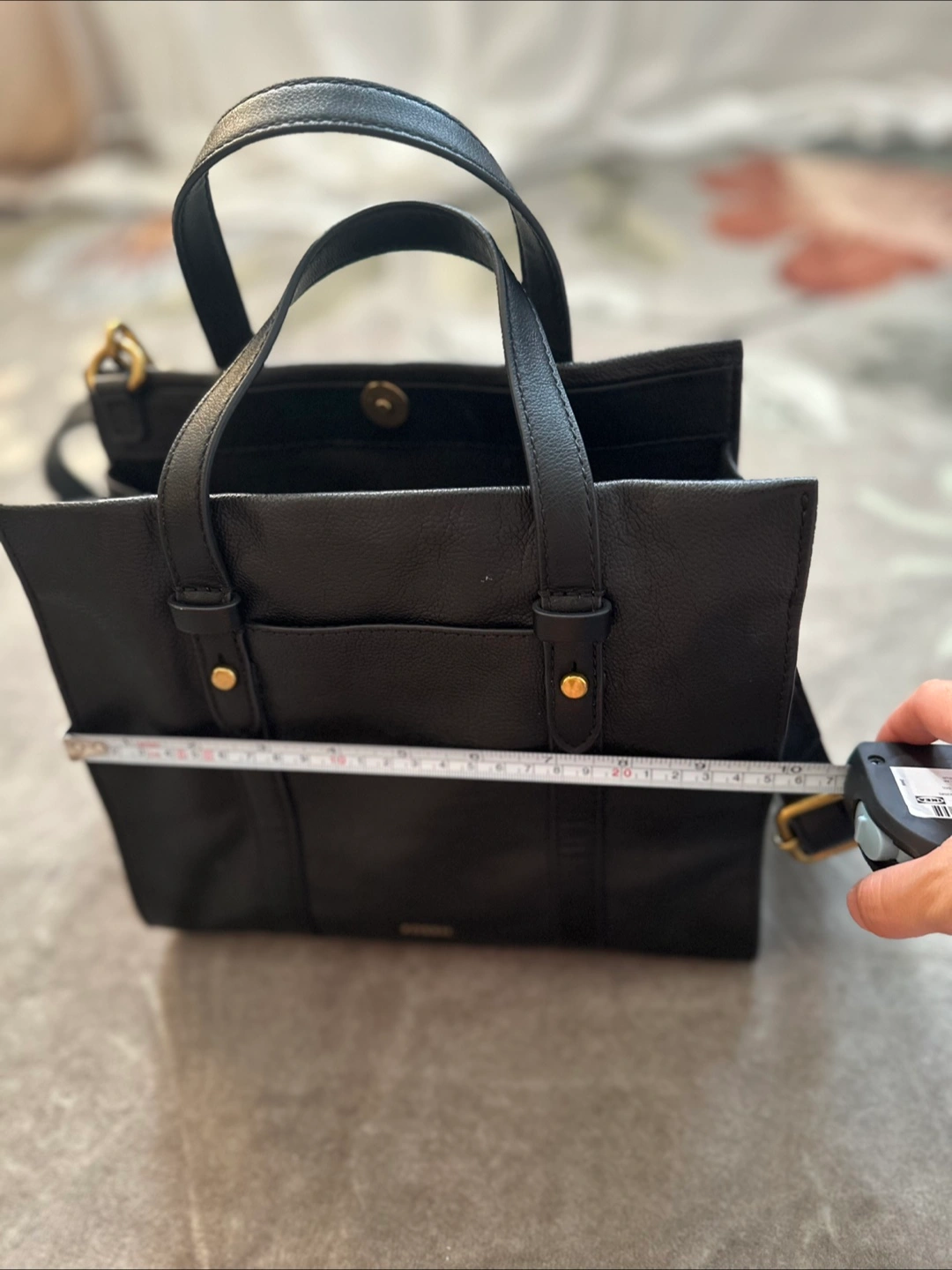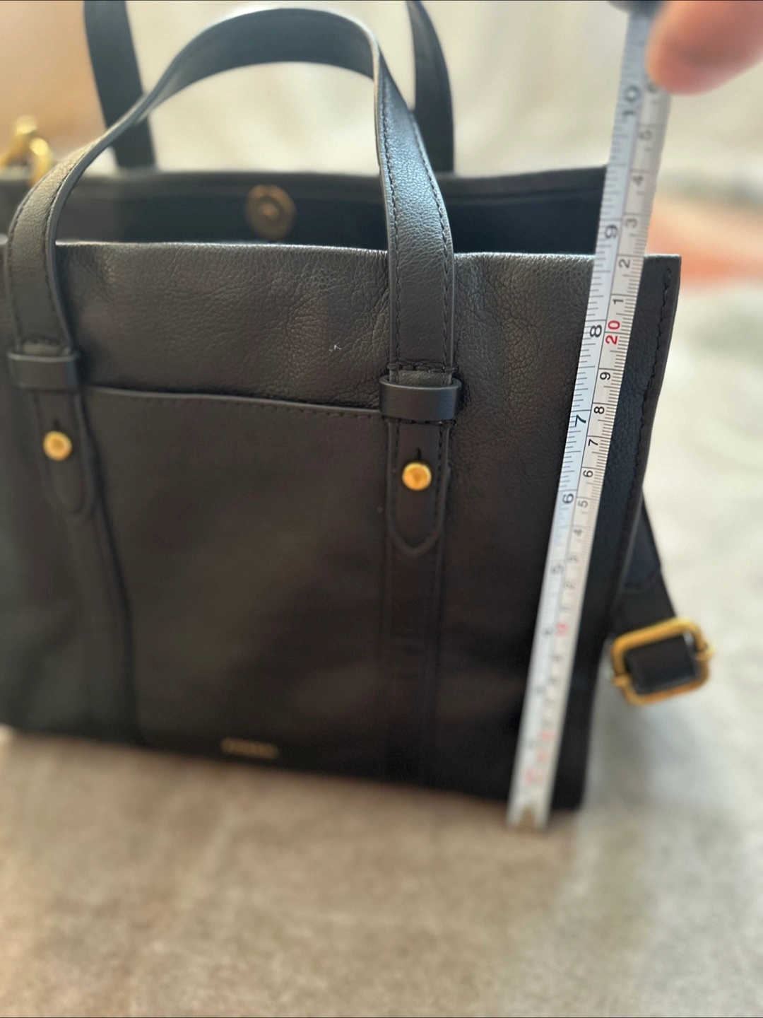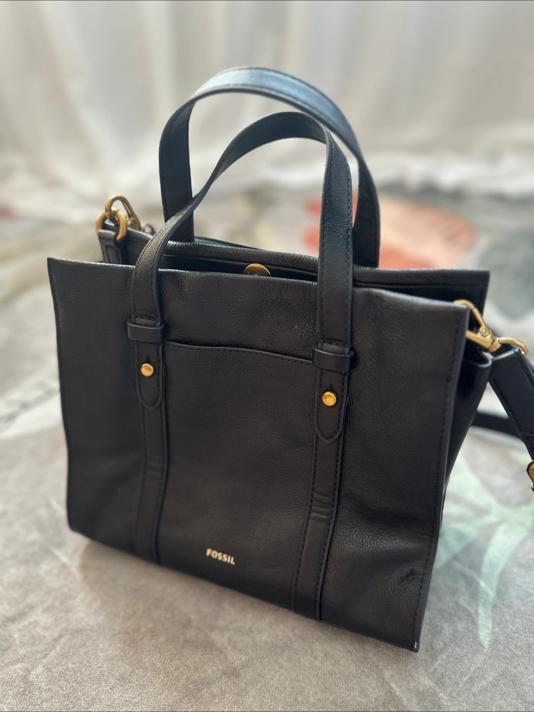Selling a Fossil black leather handbag! It's in great condition and perfect for everyday use. The size is about 10 inches in length and 8 inches in height.
