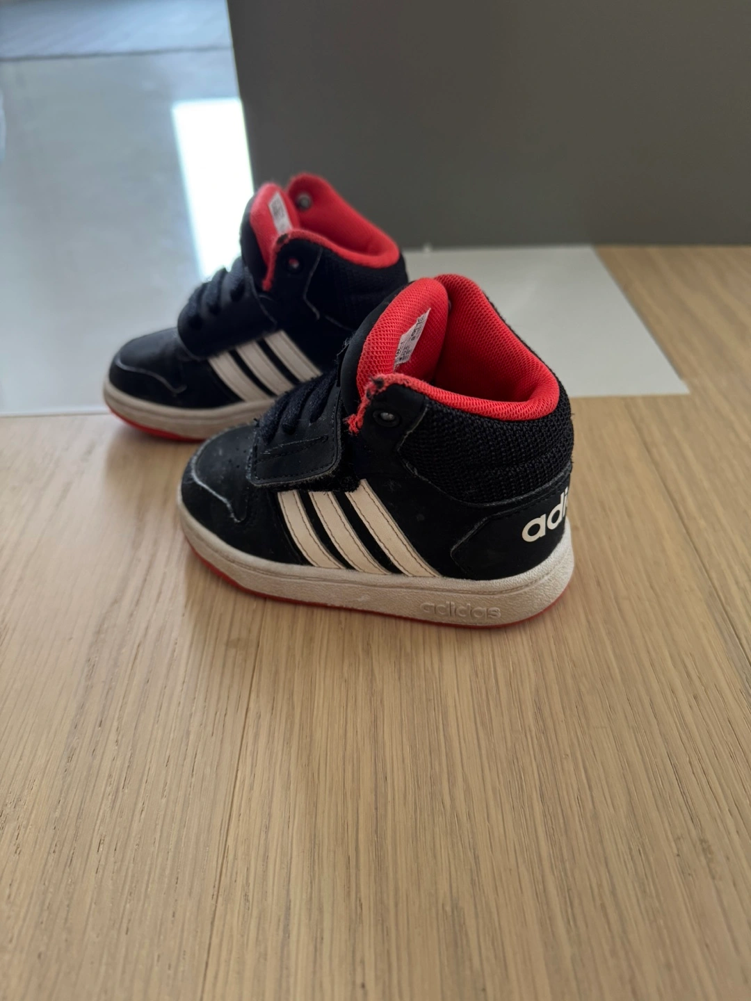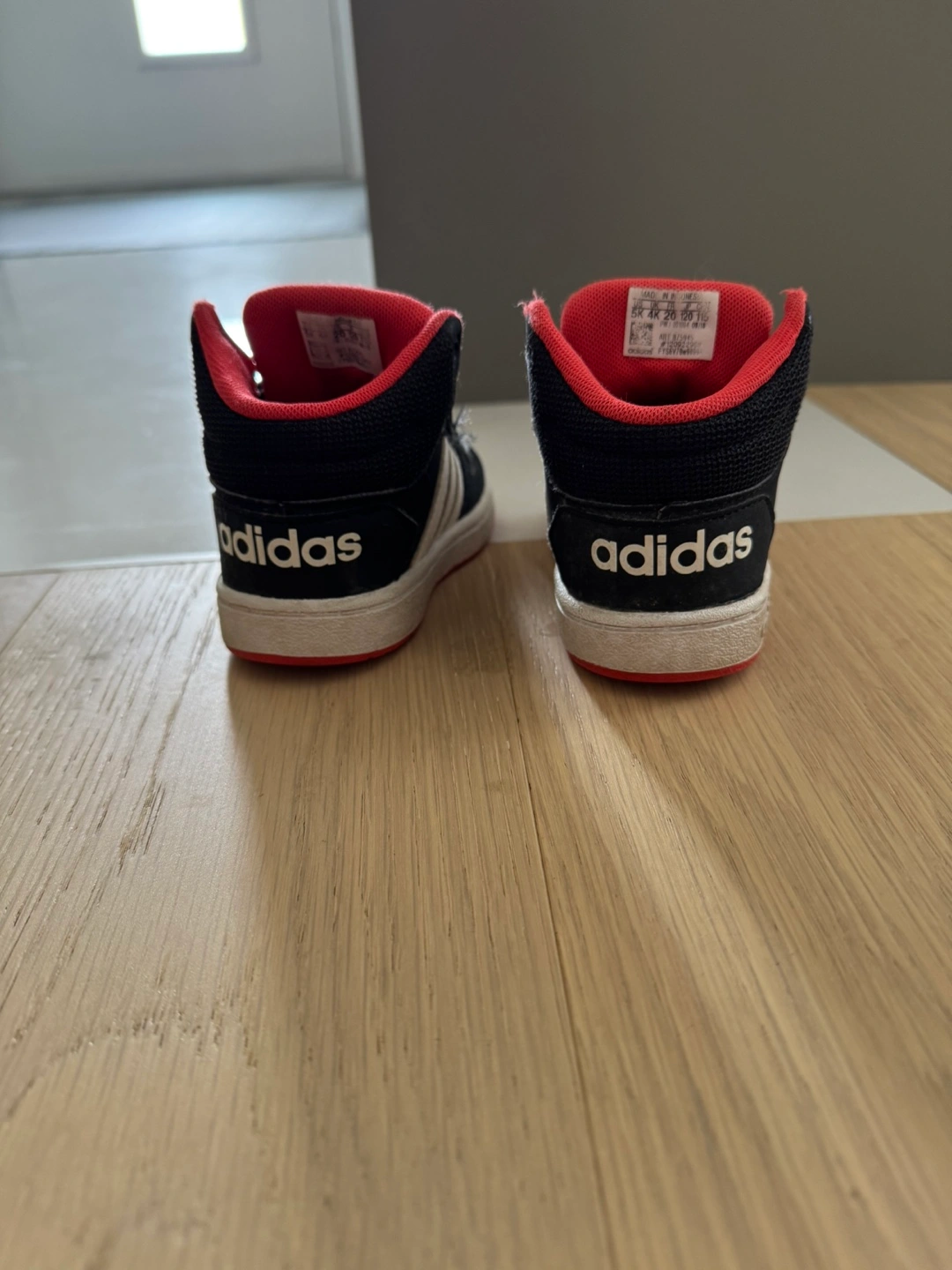 Selling a pair of Adidas kids' high-top sneakers! These are in a size 5K and feature the classic Adidas stripes. They're black with red accents, perfect for your little one's active adventures