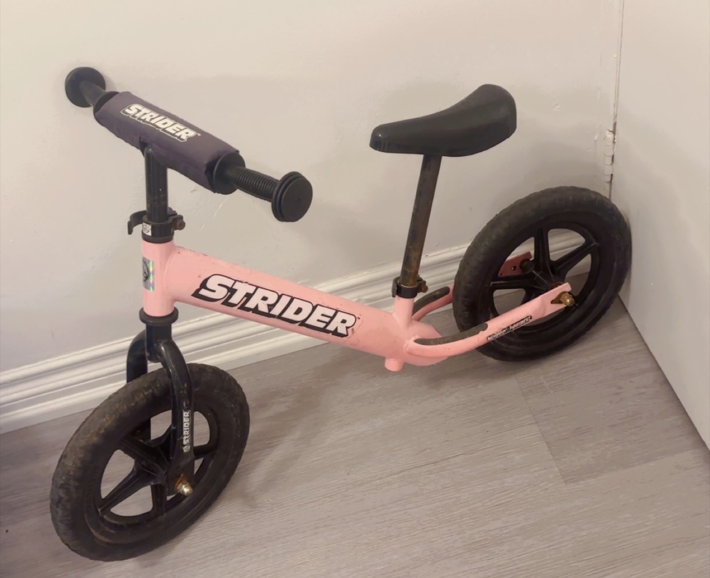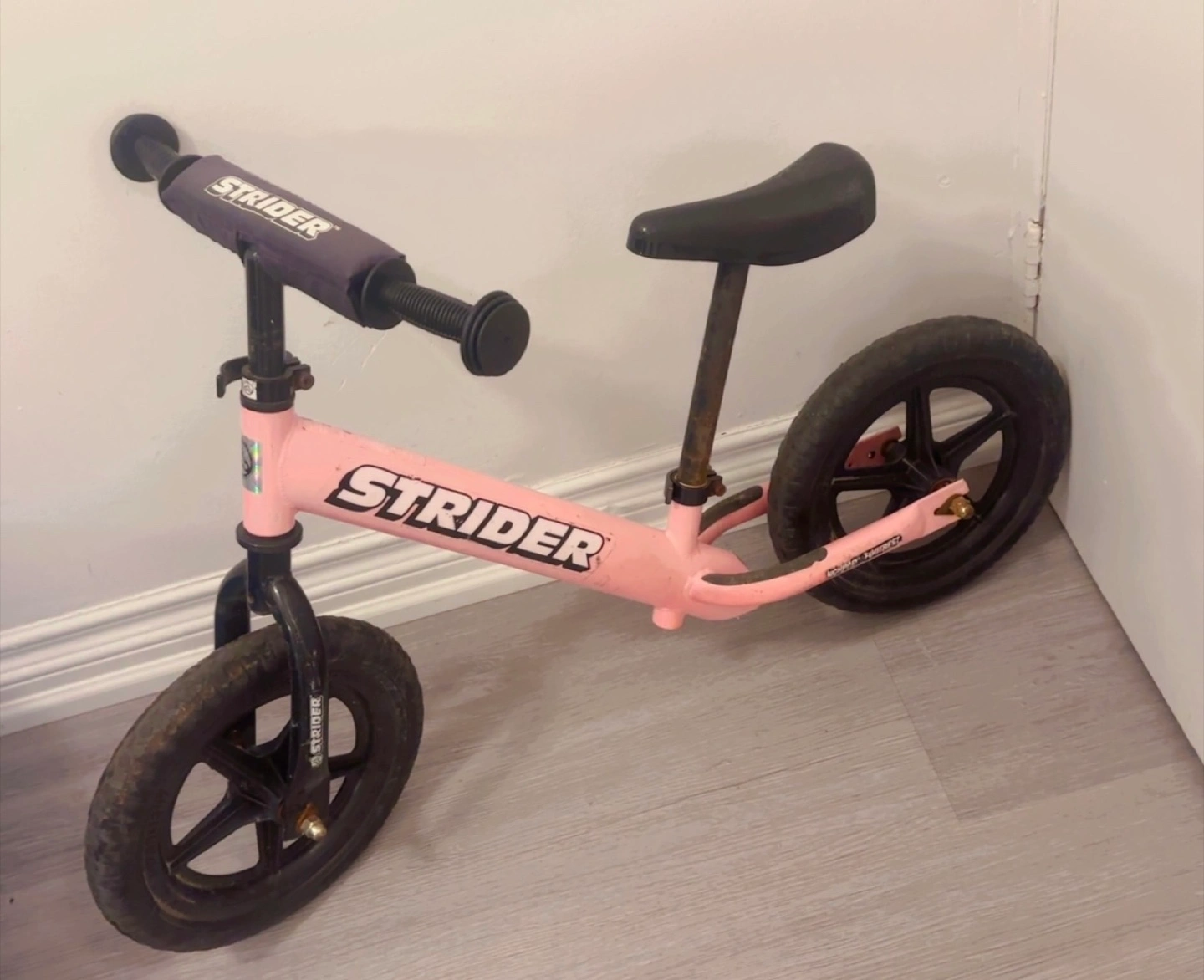 Selling a used Strider balance bike in pink! It's perfect for little ones learning to balance before transitioning to a pedal bike. It has some signs of wear, but is still in good working condition.