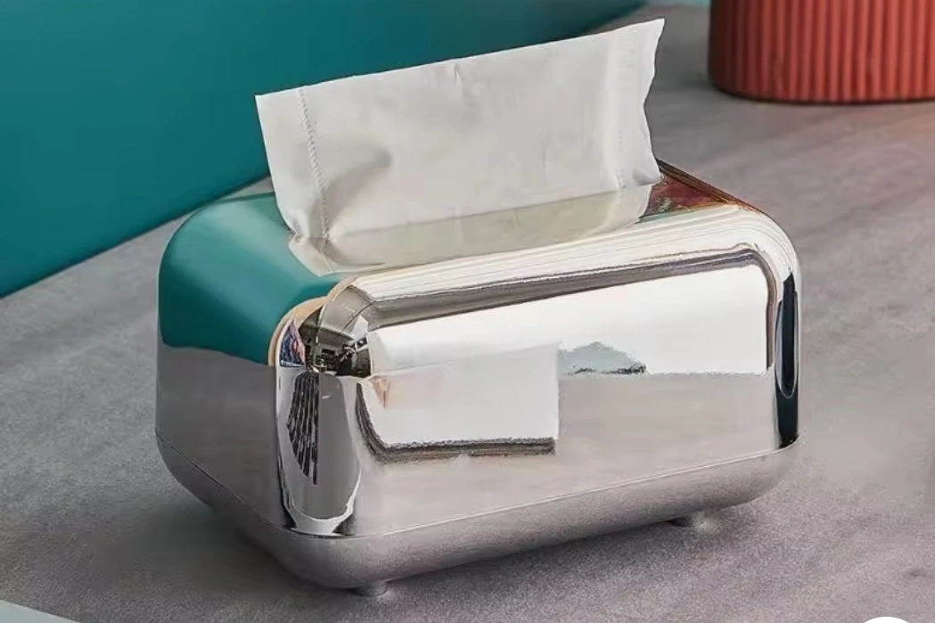 Here's a stylish tissue box cover to keep your tissues neat and tidy! It's a sleek silver colour and measures approximately 18cm x 12cm x 11cm