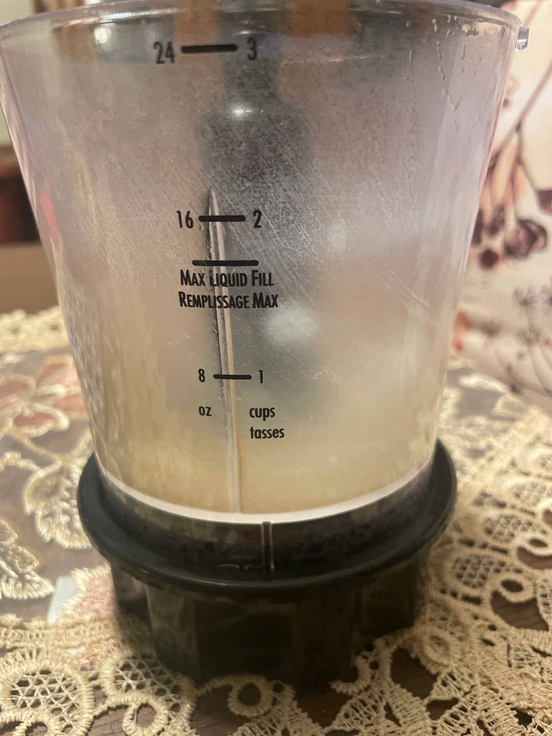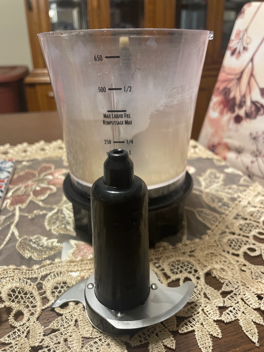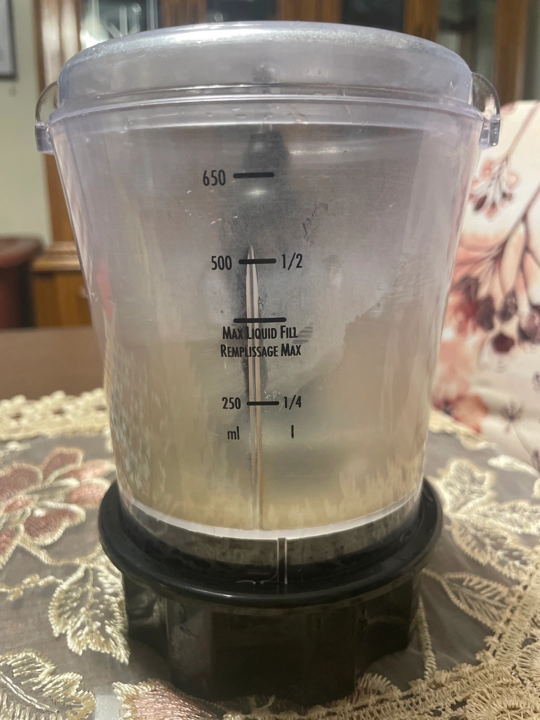 Giving away a food processor attachment, perfect for all your chopping and blending needs! It shows the max liquid fill and has measurements in both cups and ml. It’s slightly stained as seen in the picture after grinding some spices. That will go way in a few washes!