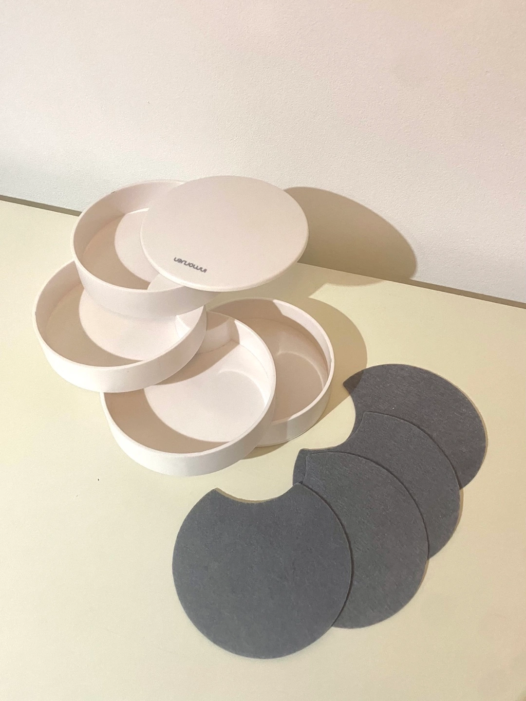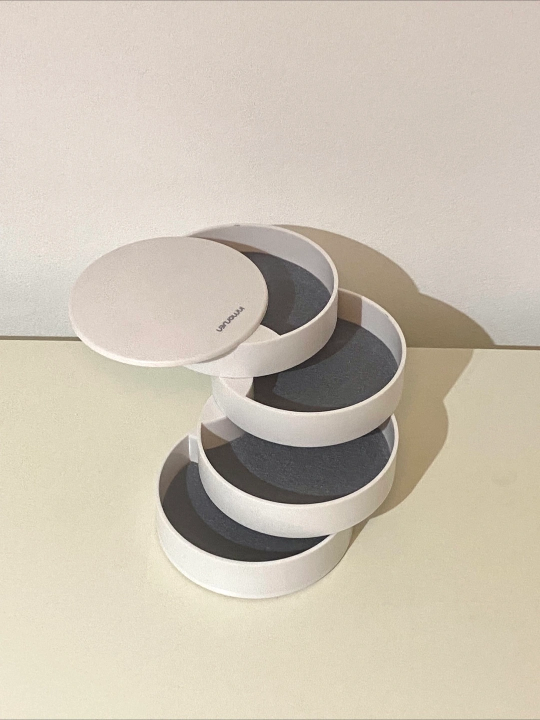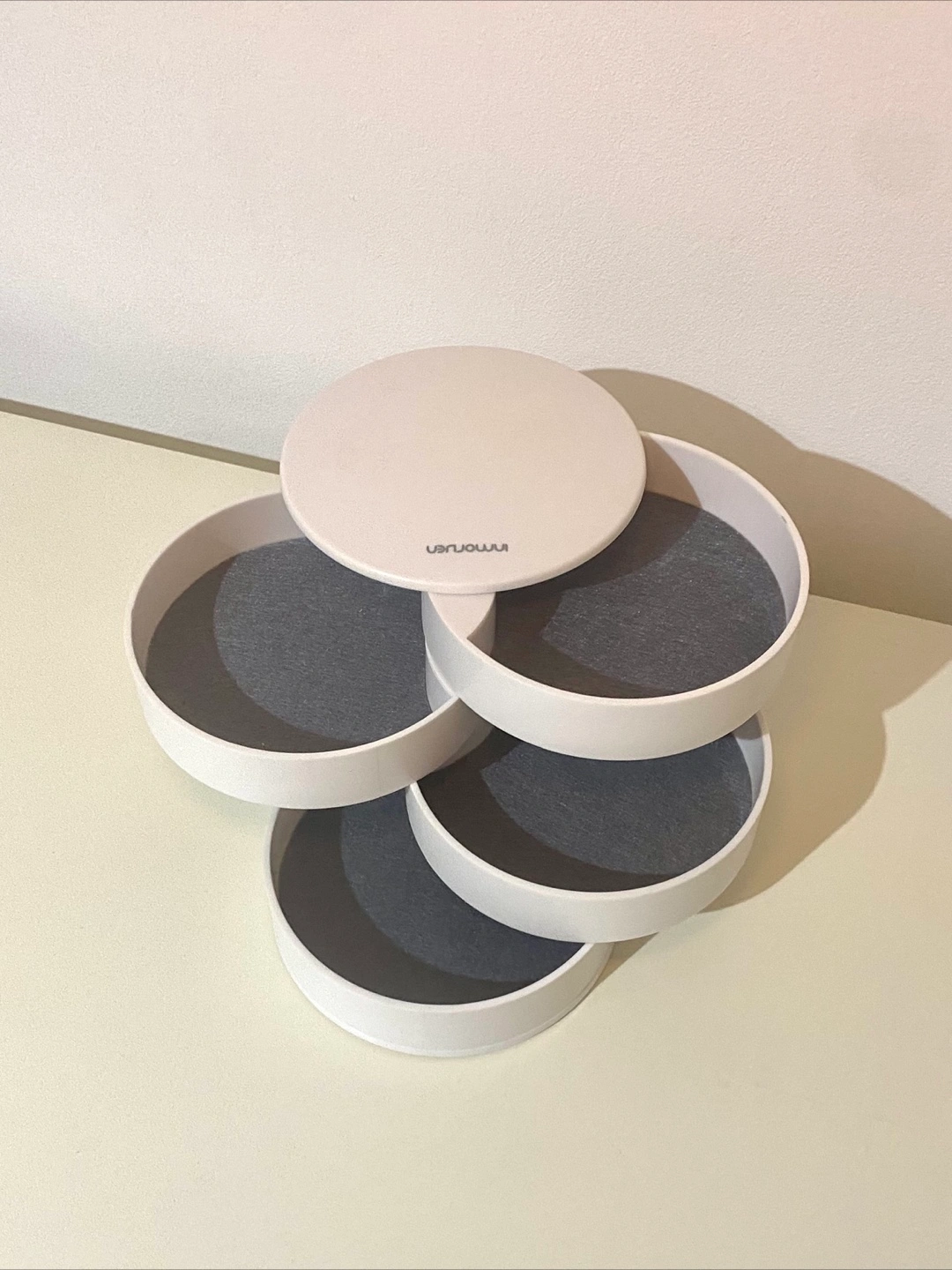 White jewelry organizer with 4 adjustable tiers and no damage, like new. Comes with removable felt pads to protect jewelry from scratching.