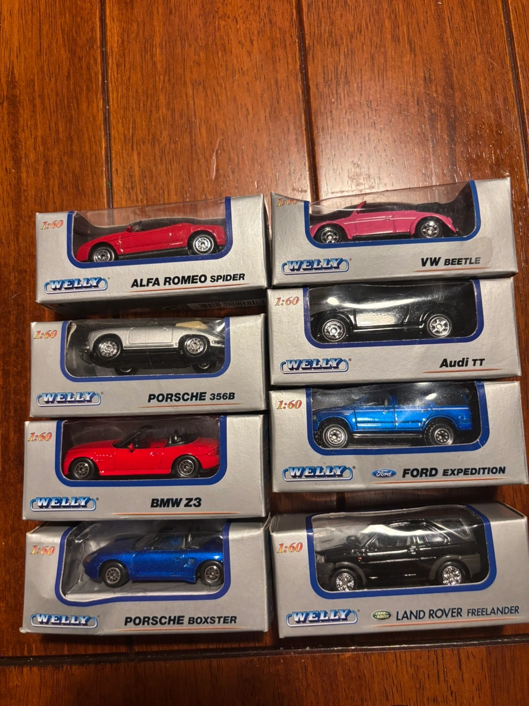 Selling a collection of Welly 1:60 scale diecast cars, all new in their original boxes! These are great for collectors or as fun toys. The collection includes: