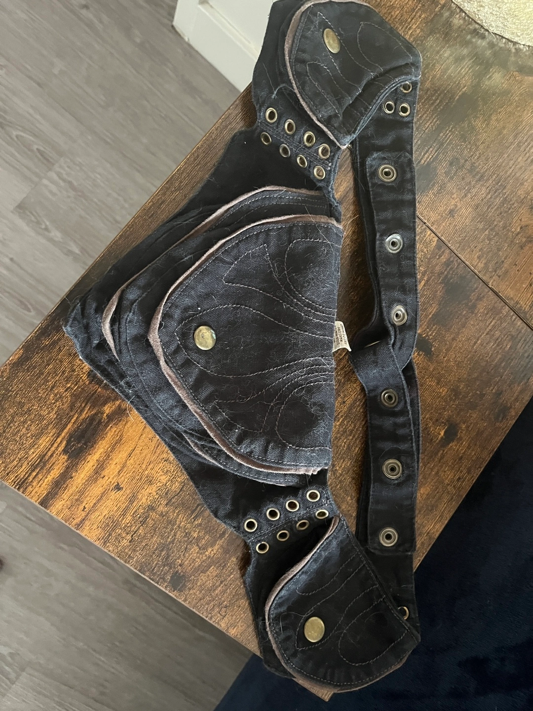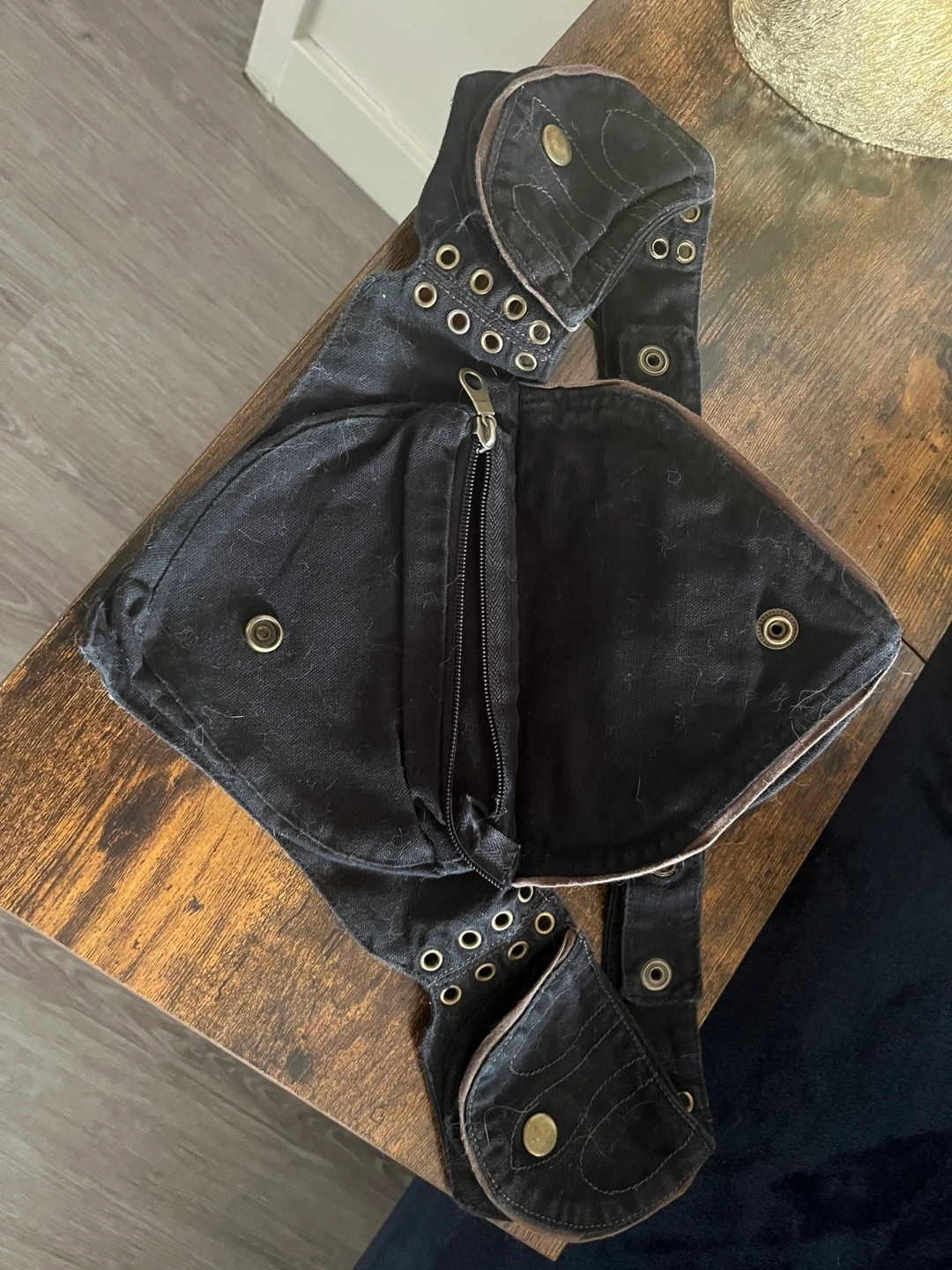 Selling a Relic Little Gypsy bag in black denim. It's in great condition and has a unique design with eyelet and button details. It has a zipper pocket and multiple compartments. Pick up only