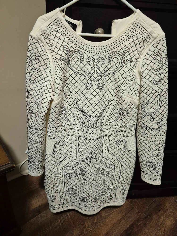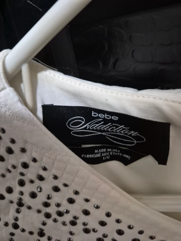 Selling a Bebe Addiction dress in size L/G. This dress is white and features a unique studded design throughout. Only worn once! Paid over $200 at yorkdale mall for it!