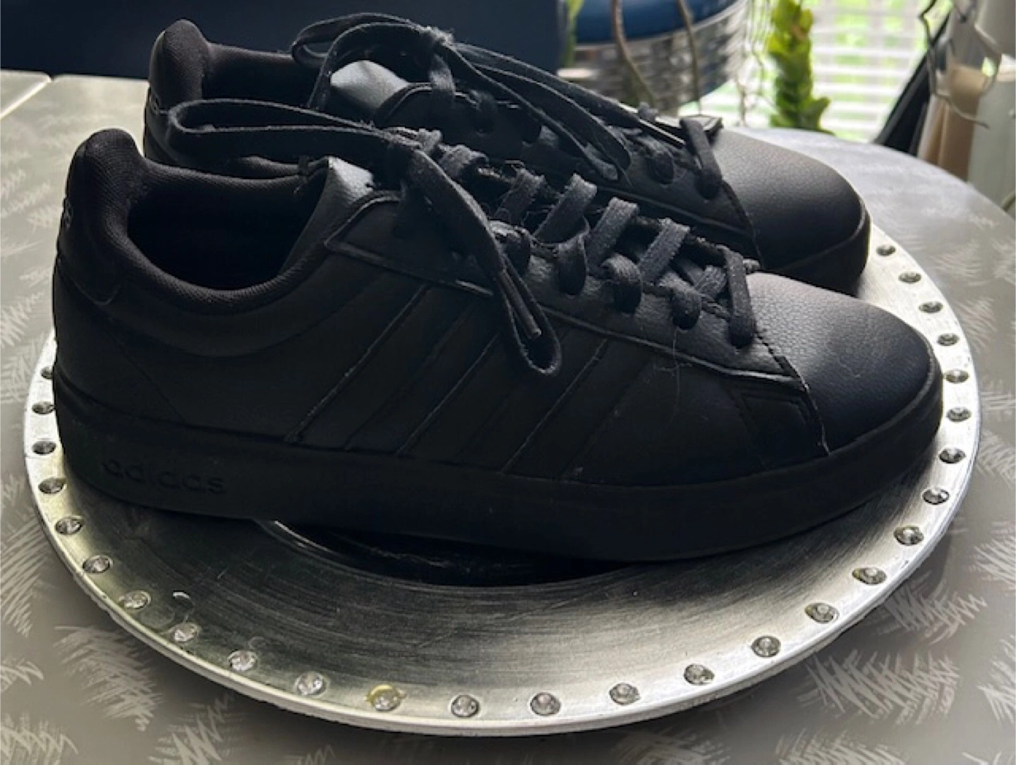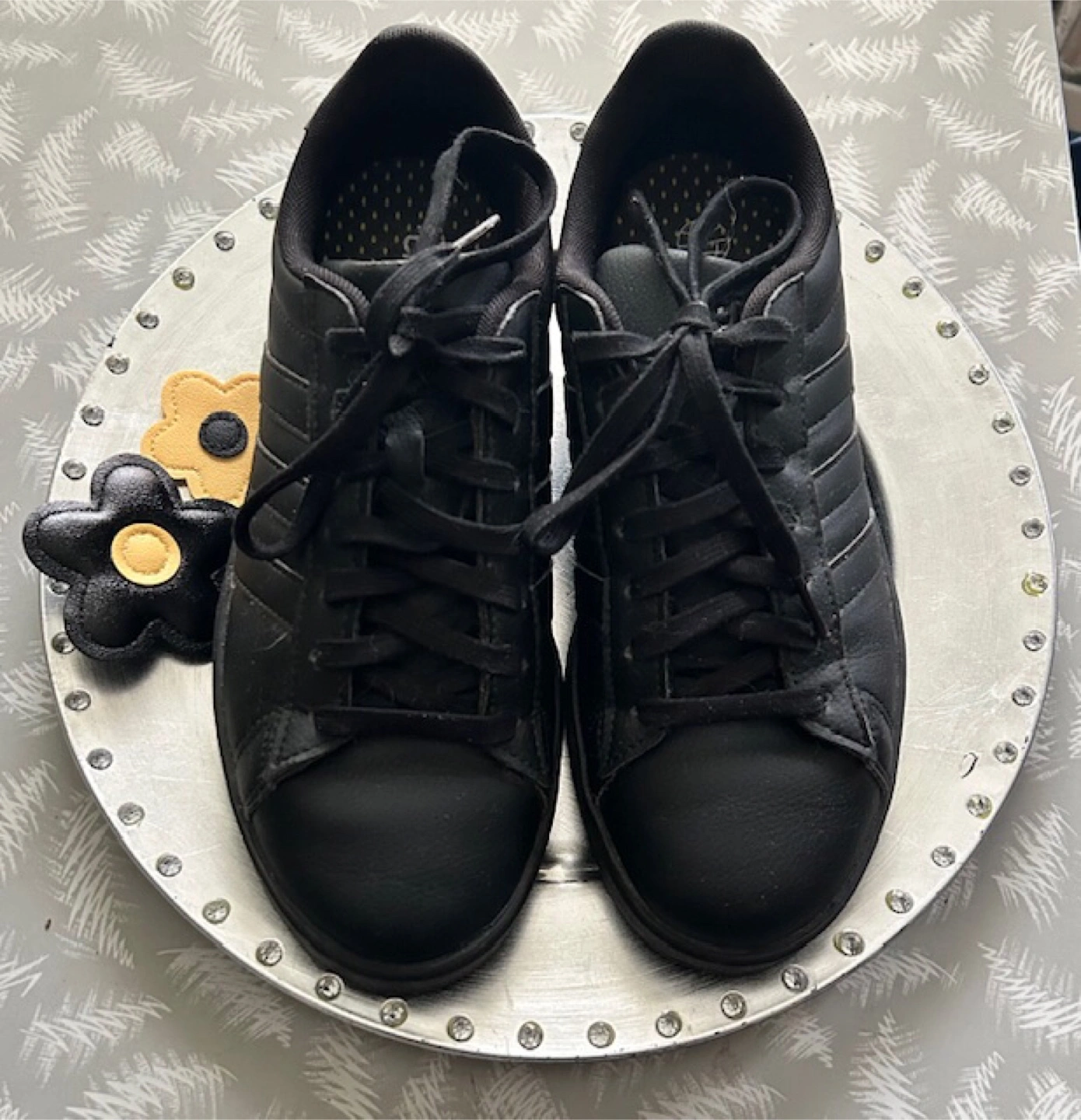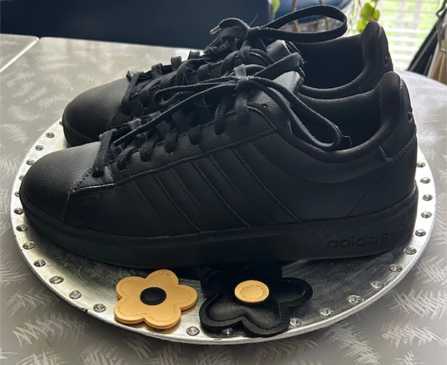 Selling a pair of Adidas Grand Court Base sneakers in black. They're in great shape and ready for a new home! The shoes feature the classic Adidas three-stripe design and a comfortable fit. Perfect for everyday wear or hitting the gym. These shoes have only been worn a few times indoors for a dance recital and a couple of rehearsals 🤩