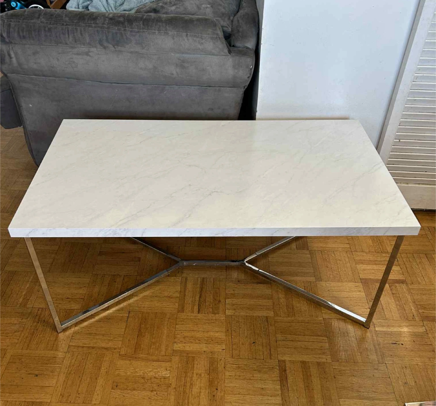Selling a coffee table with a faux marble top and a sleek, modern design. The table features a white faux marble surface and a geometric metal base. It's in great condition and would look lovely in any living room!
