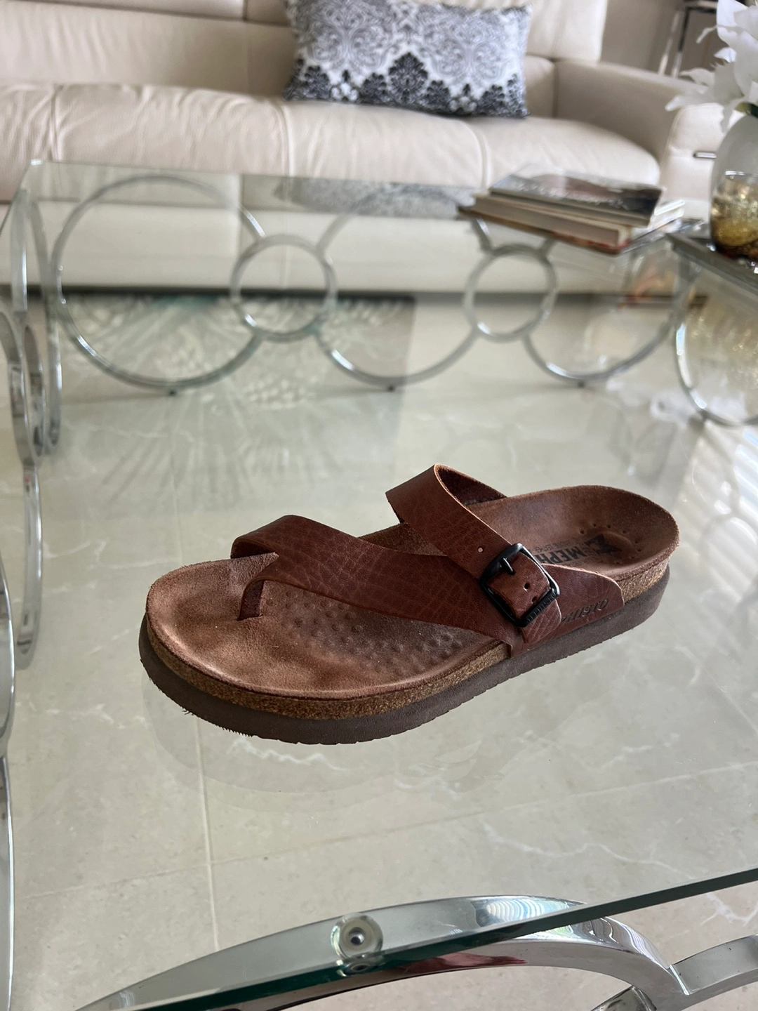 Selling a pair of Mephisto Helen sandals in brown leather. These sandals feature a cork footbed with reflex zones for massage. They're perfect for everyday wear and provide great comfort!