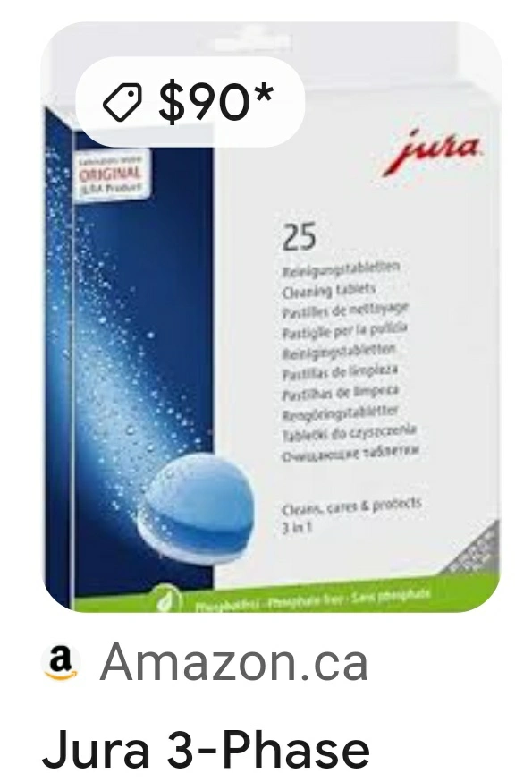Selling a box of Jura 3-Phase Cleaning Tablets! These tablets are designed to clean, care for, and protect your Jura coffee machine in 3-in-1 action. The box contains 25 tablets, and they're phosphate-free.