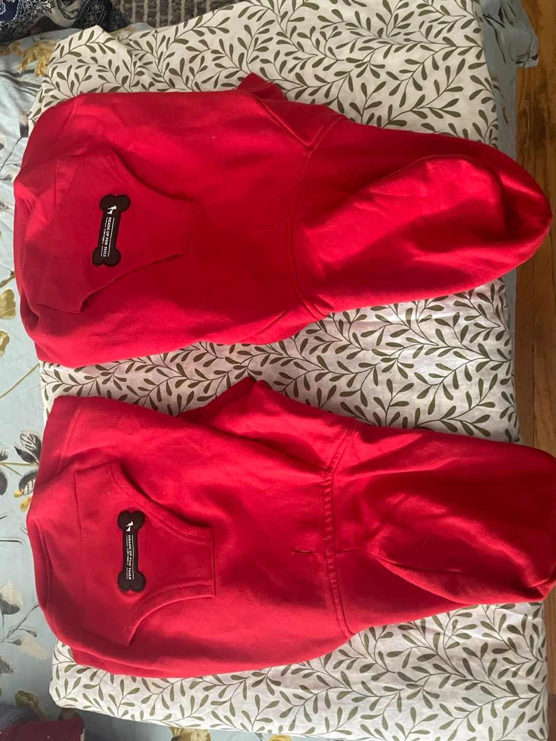 Two matching red dog hoodies, perfect for keeping your furry friends warm! They are size small and in great condition. Each hoodie features a cute bone-shaped detail on the back pocket with a provision for your leash!