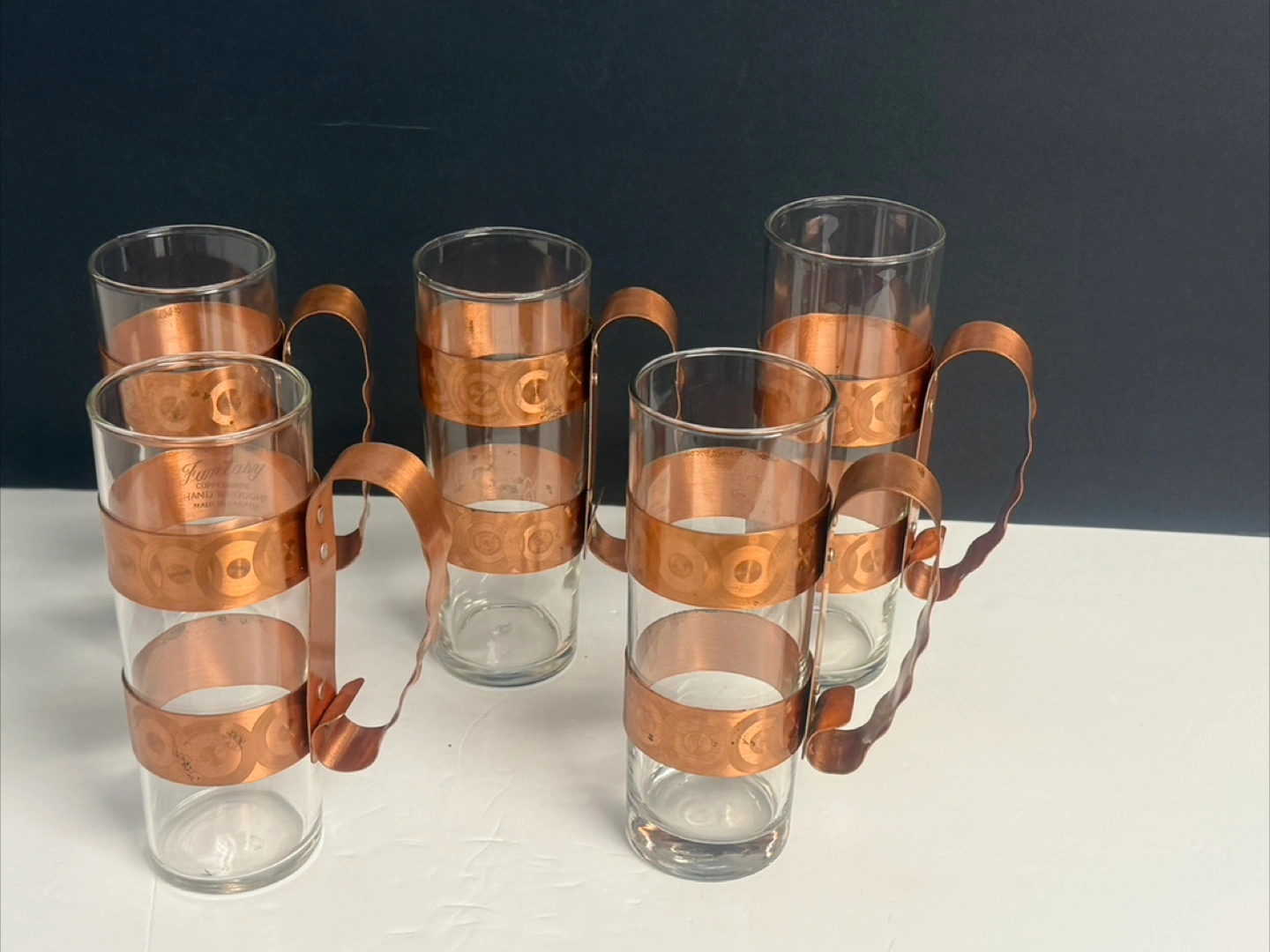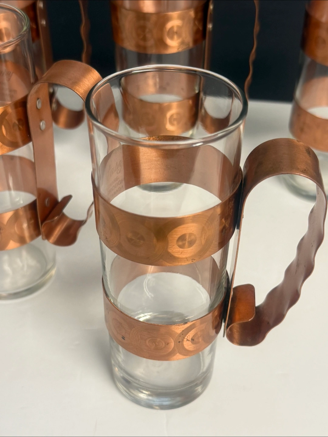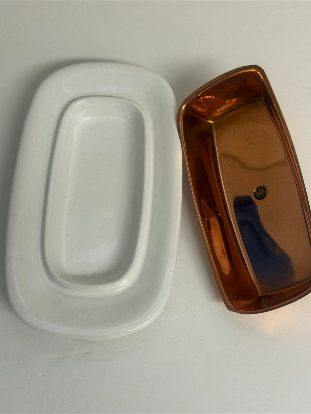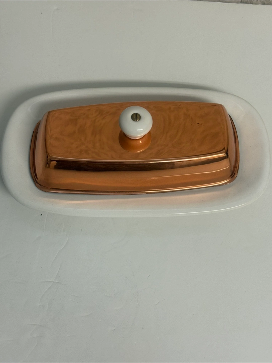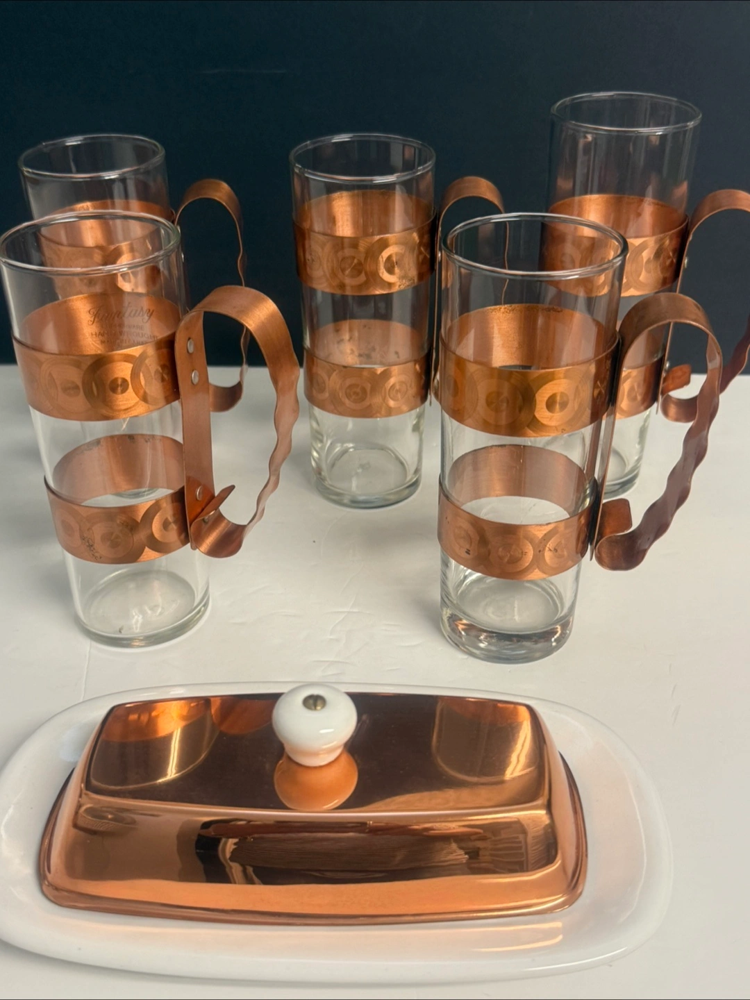 I'm selling a lovely Genin Trudeau butter dish with a copper lid and a set of matching mugs. These pieces have a charming vintage look that would add a touch of warmth to any kitchen or dining area. The butter dish features a white ceramic base and a copper-coloured lid, while the mugs have clear glass with copper accents. Great for collectors or anyone who appreciates unique home decor!