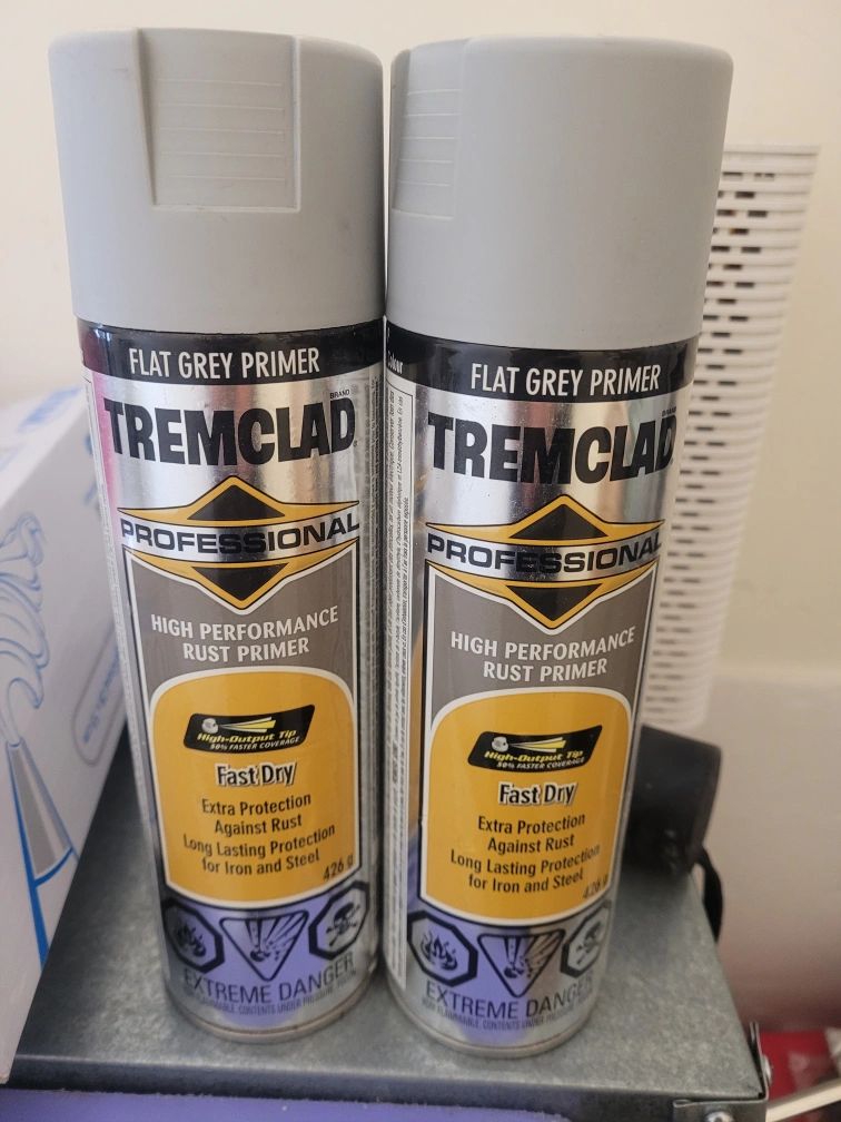 Selling two cans of Tremclad Professional Flat Grey Primer. This high-performance rust primer is designed for extra protection and long-lasting protection for iron and steel. It's also fast drying, making your projects quicker and easier