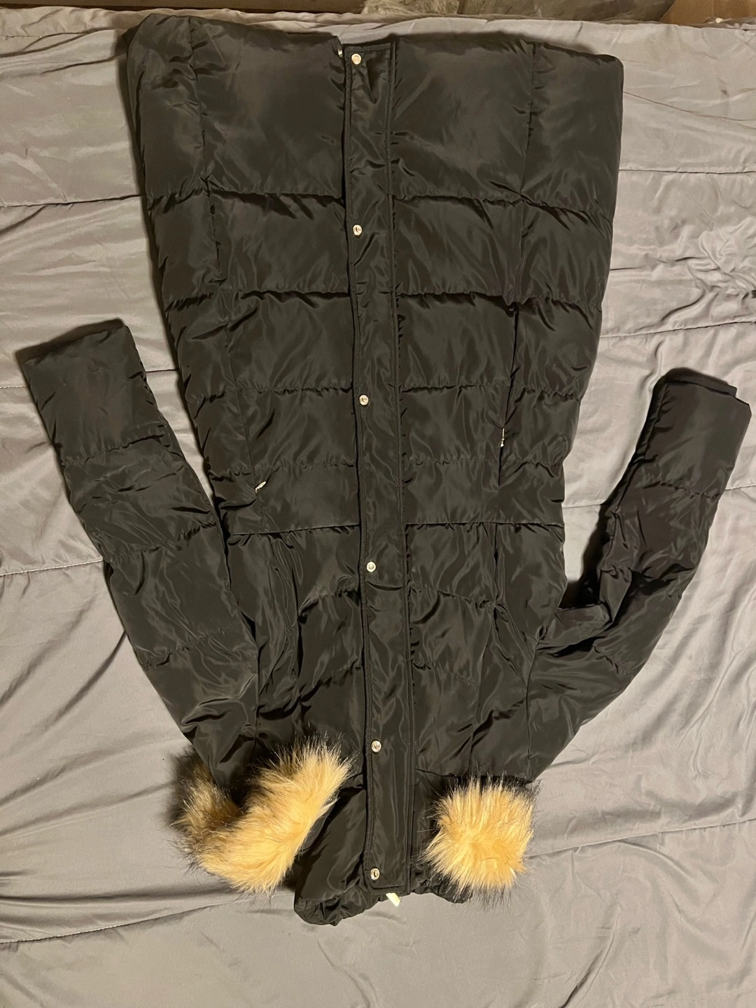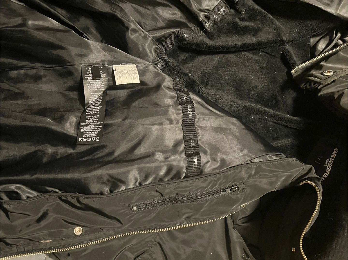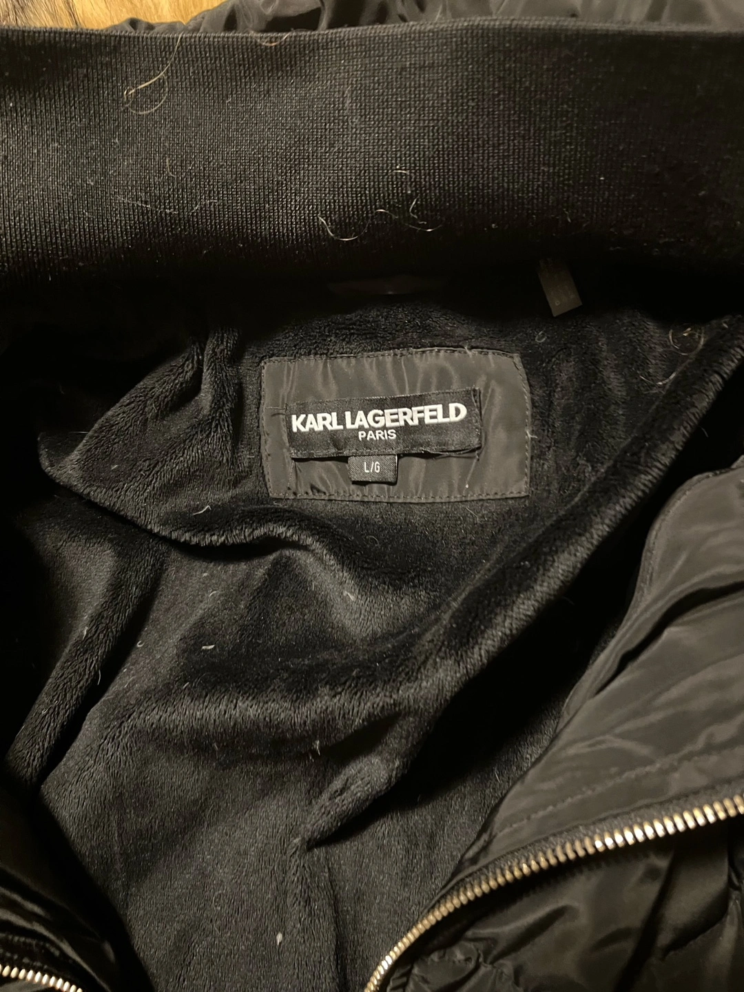 Selling a Karl Lagerfeld puffer coat in black. It's a size L/G (Large). The coat features a faux fur hood trim. It's in great condition and ready for a new home!