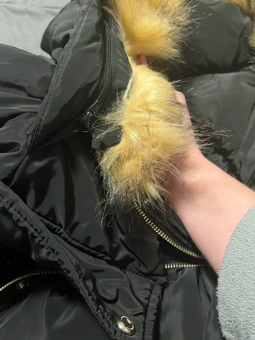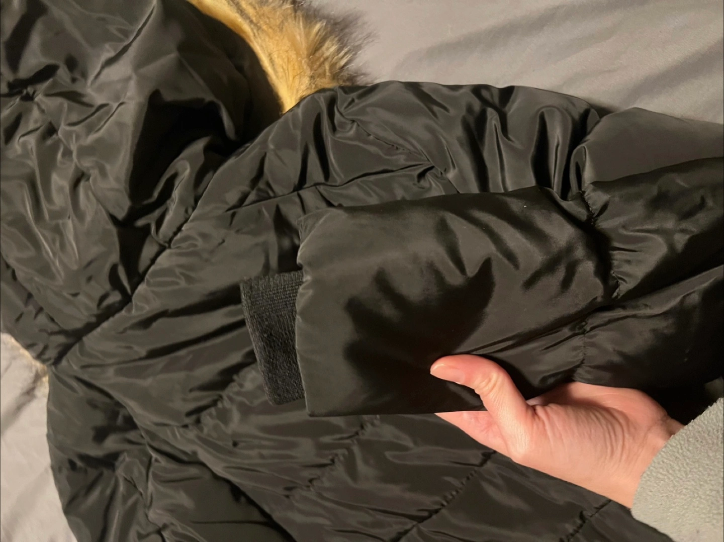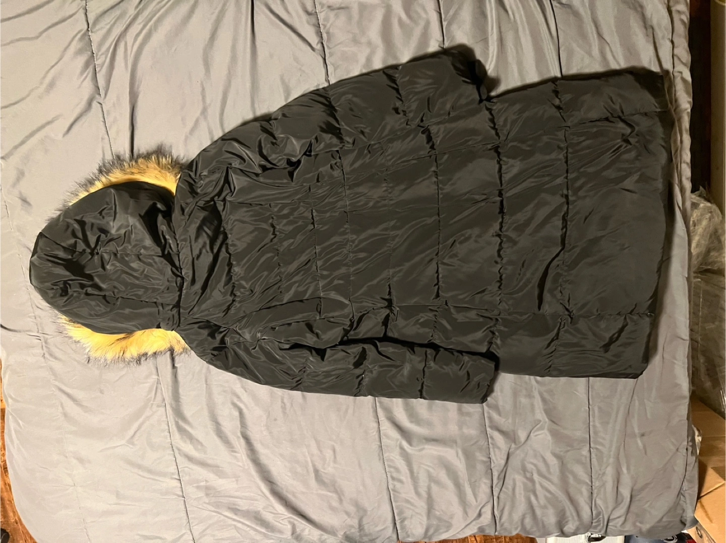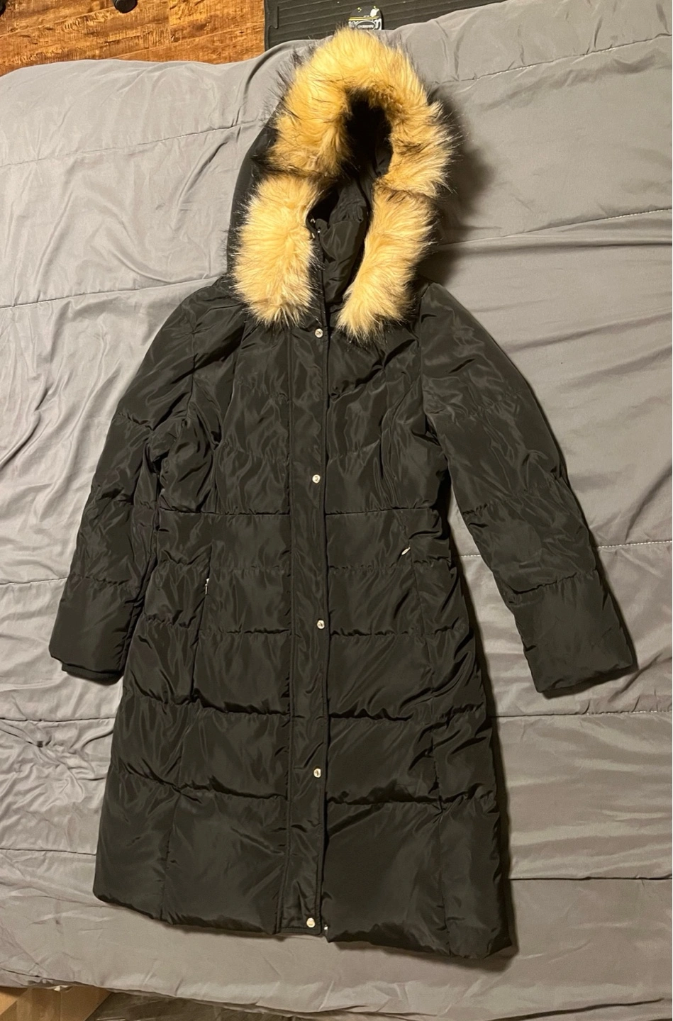 Selling a Karl Lagerfeld puffer coat in black. It's a size L/G (Large). The coat features a faux fur hood trim. It's in great condition and ready for a new home!