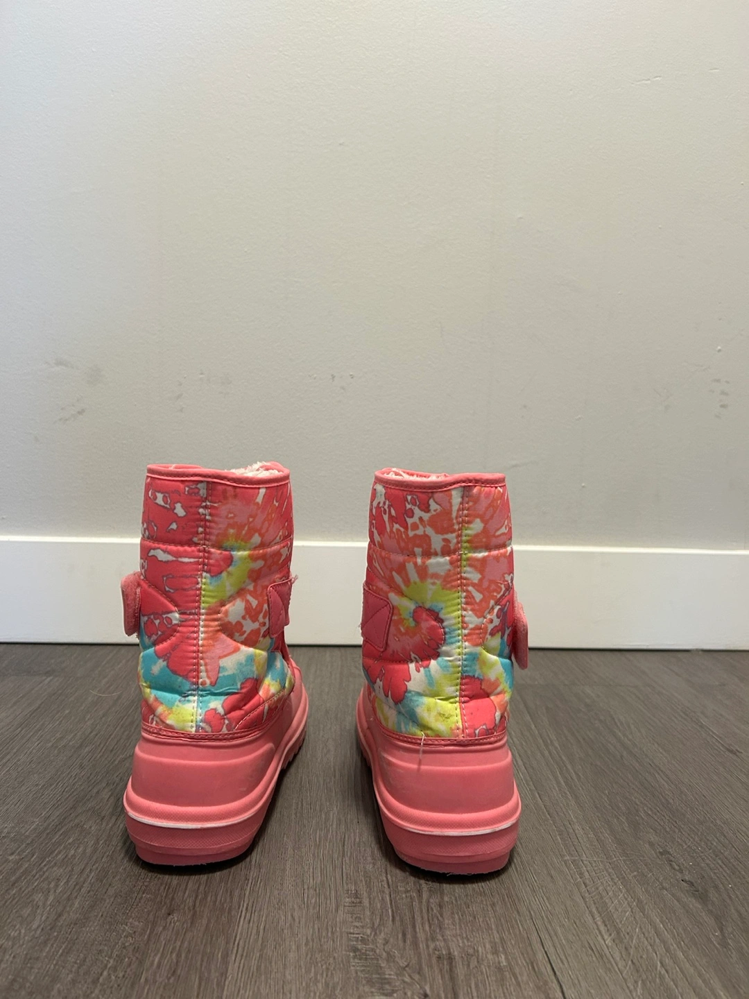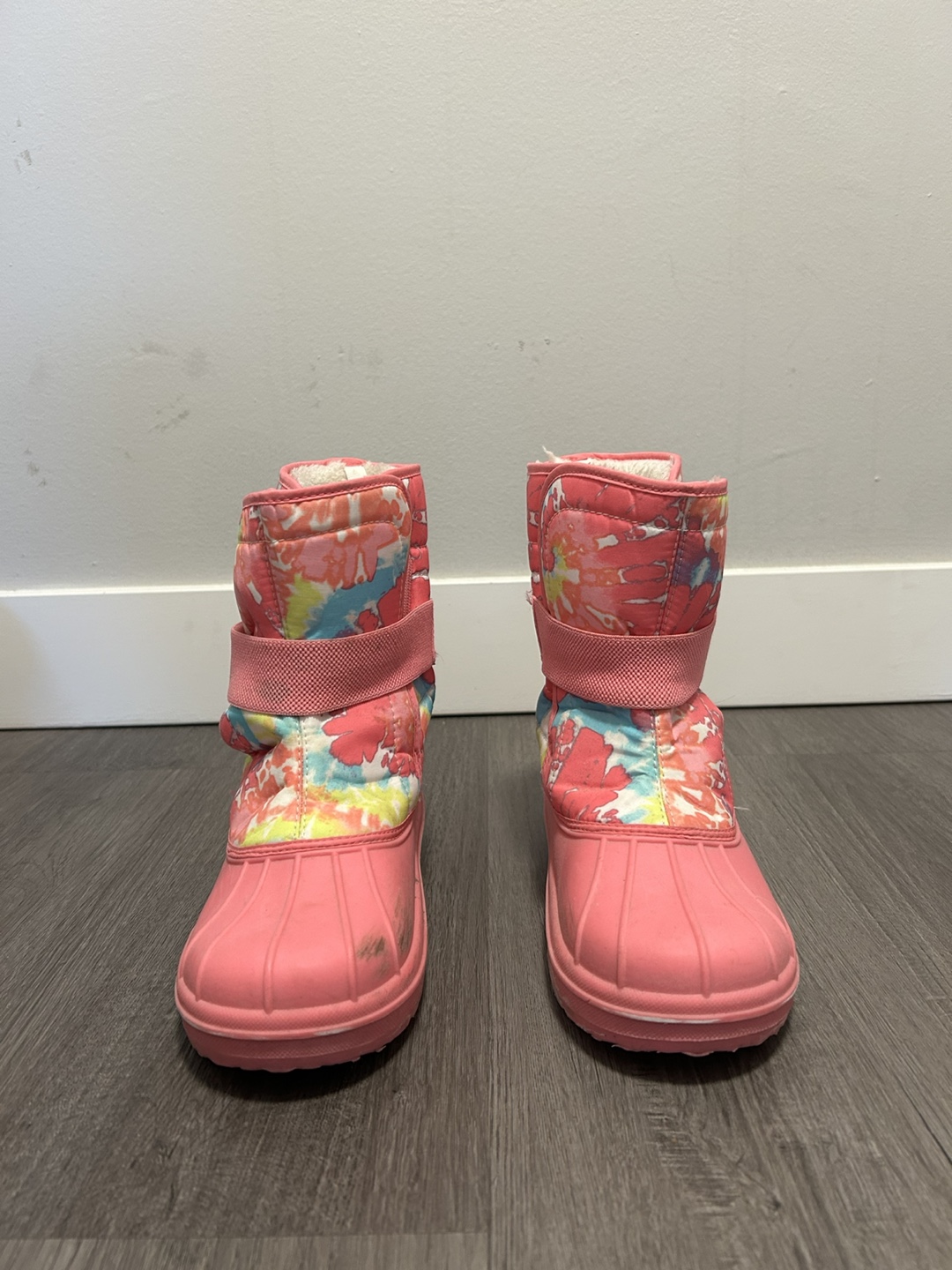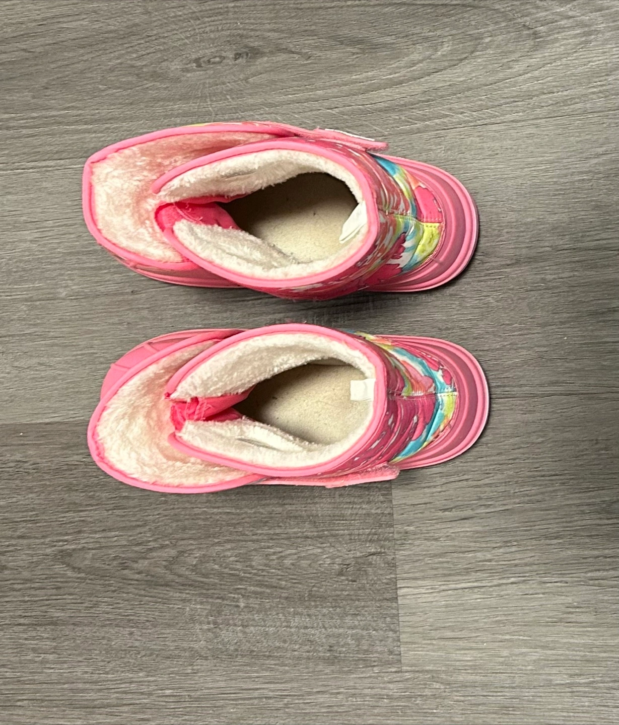 Cute pink winter boots, perfect for keeping little feet warm and dry during the snowy months! They have a fun, colourful pattern on the upper part and a sturdy rubber sole. Size 6