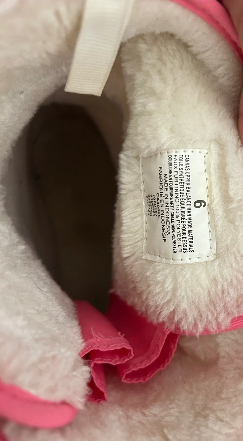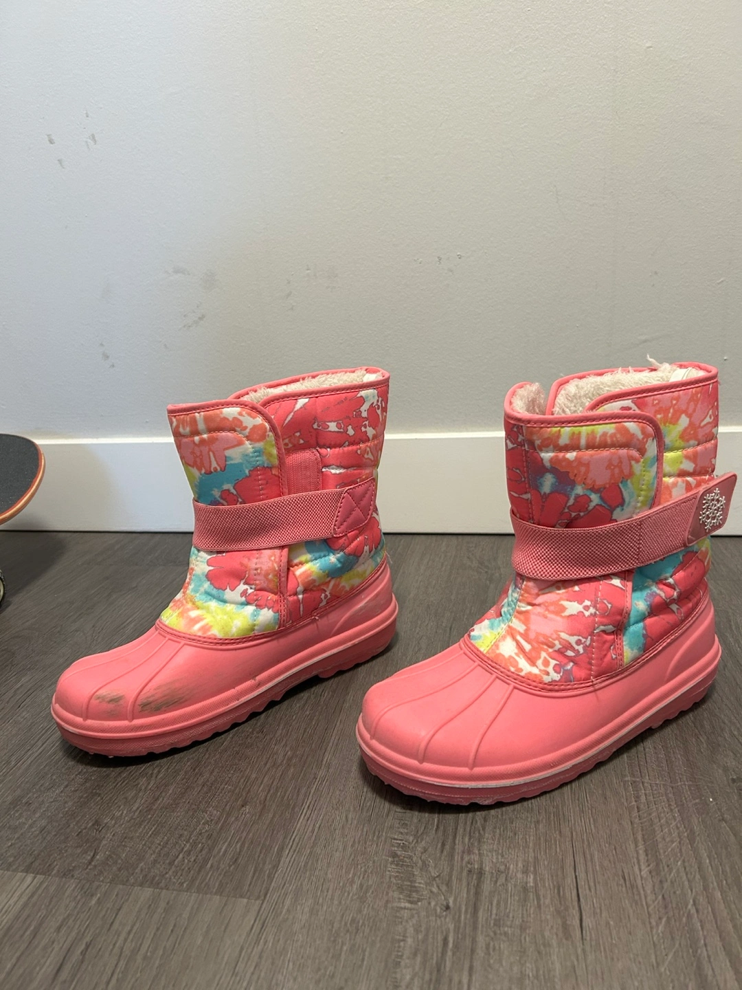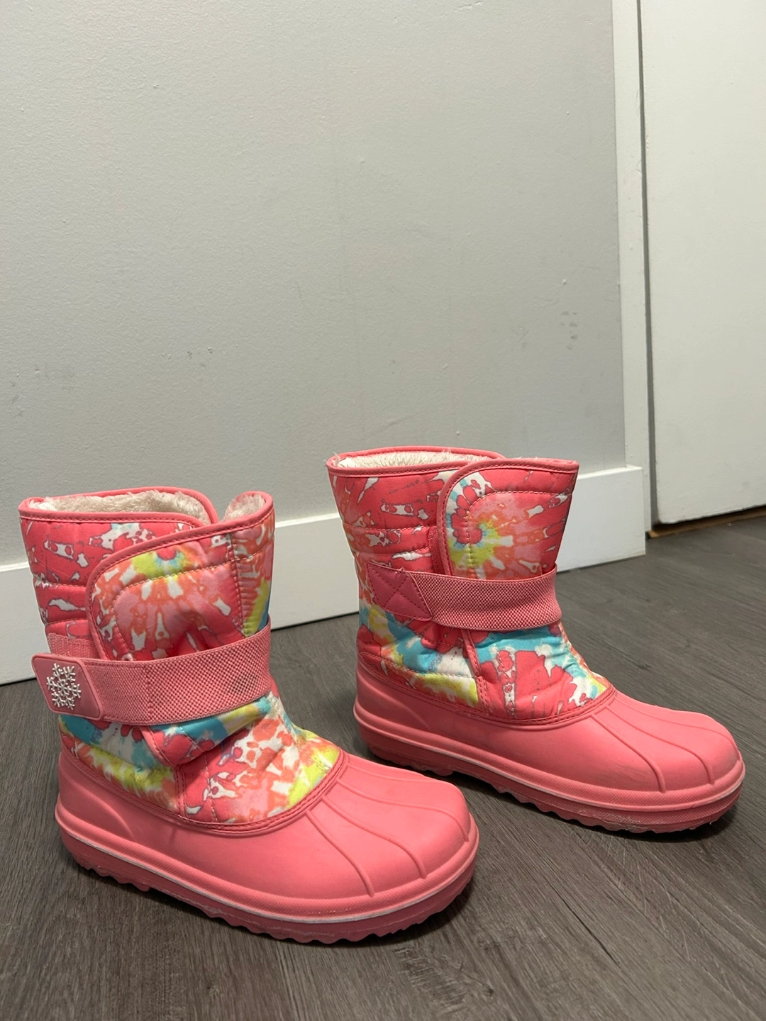 Cute pink winter boots, perfect for keeping little feet warm and dry during the snowy months! They have a fun, colourful pattern on the upper part and a sturdy rubber sole. Size 6