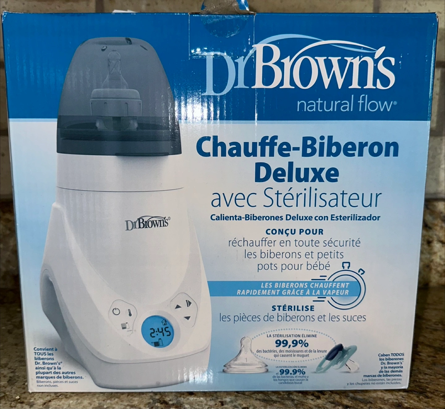 I'm selling a Dr. Brown's Natural Flow Deluxe Bottle Warmer with Sterilizer! It's designed to safely warm bottles, baby food jars, and sterilize pacifiers and bottle parts with steam. This unit quickly warms bottles and baby food, and it's easy to use with an automatic shut-off feature.