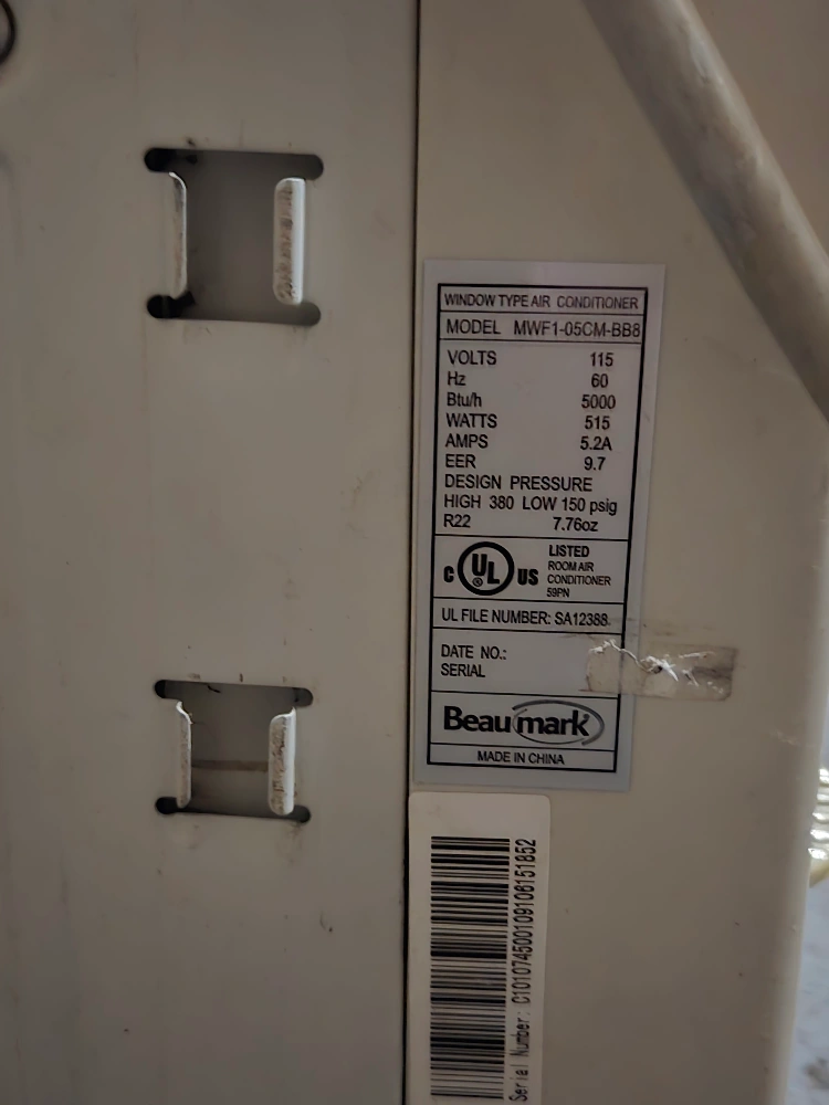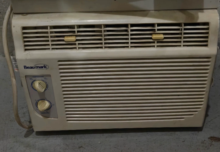 Selling a used Beaumark window type air conditioner. It's a 5000 BTU unit, perfect for cooling a small room. The model number is MWF1-05CM-BB8. It runs on 115 Volts and 60 Hz.