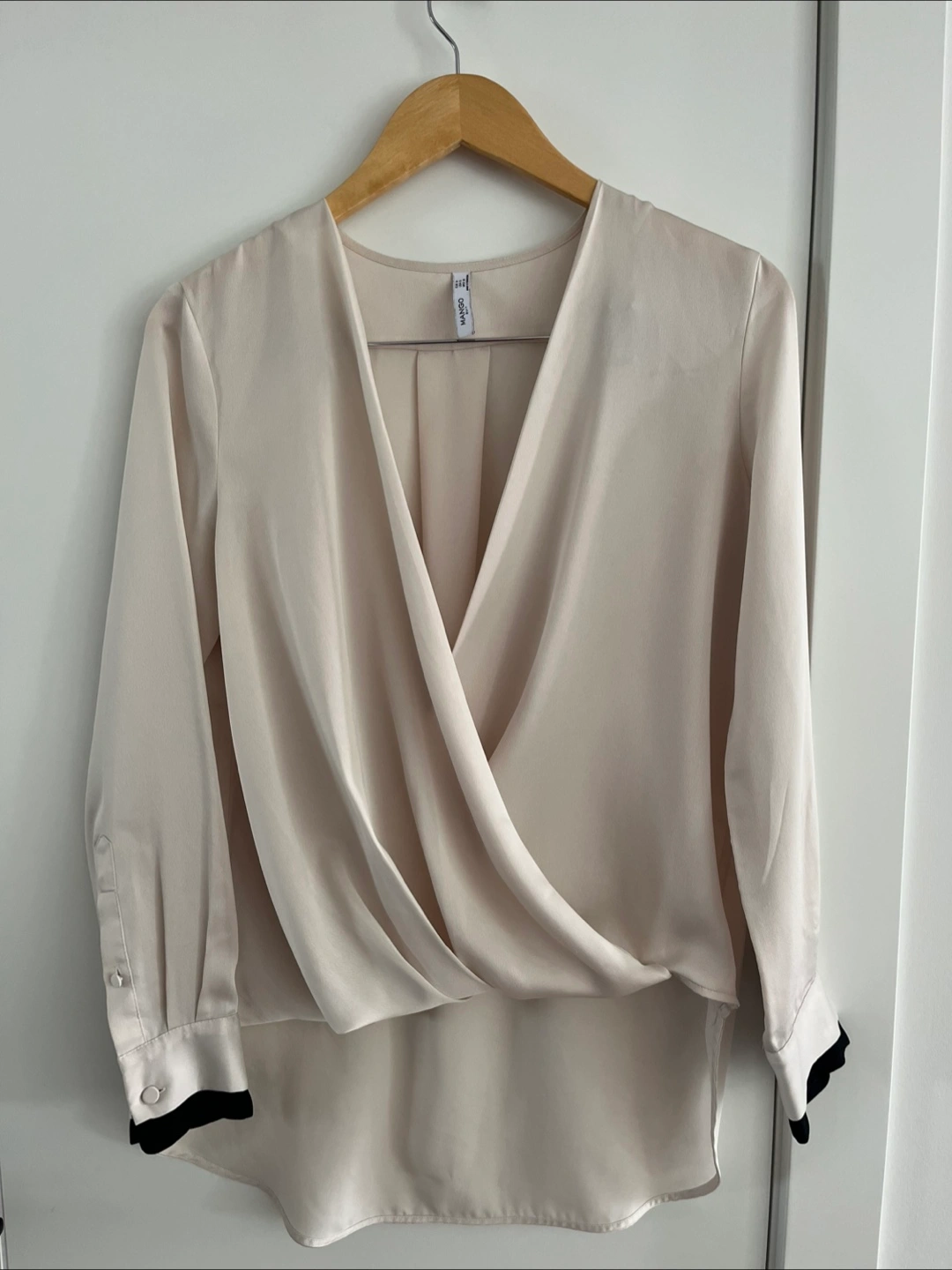 Offering a Mango Suit blouse in a lovely light beige colour and black piping detail on the sleeves. It's got a wrap-over design and fully satin polyester. Perfect for dressing up or down!