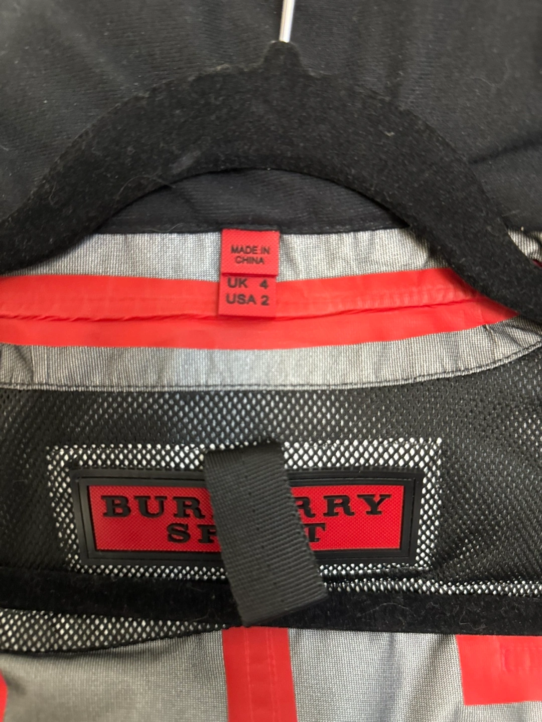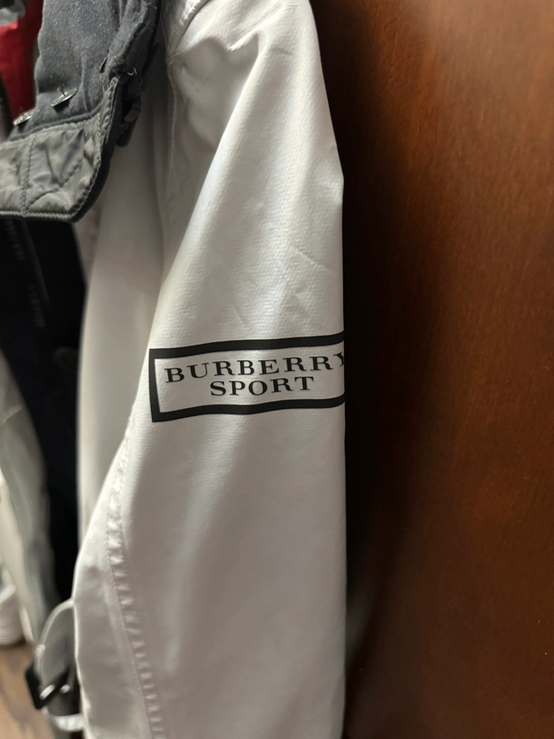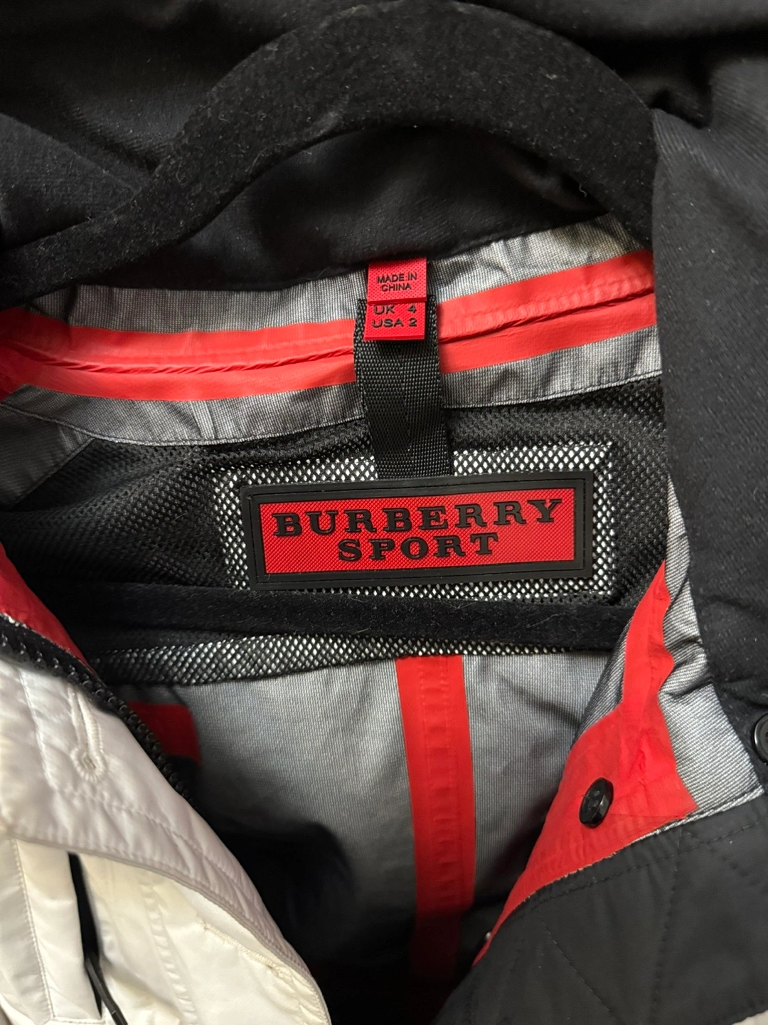 151Selling a Burberry Sport jacket in white with black accents. The size is a UK 4 / USA 2. The main fabric is 100% polyester.