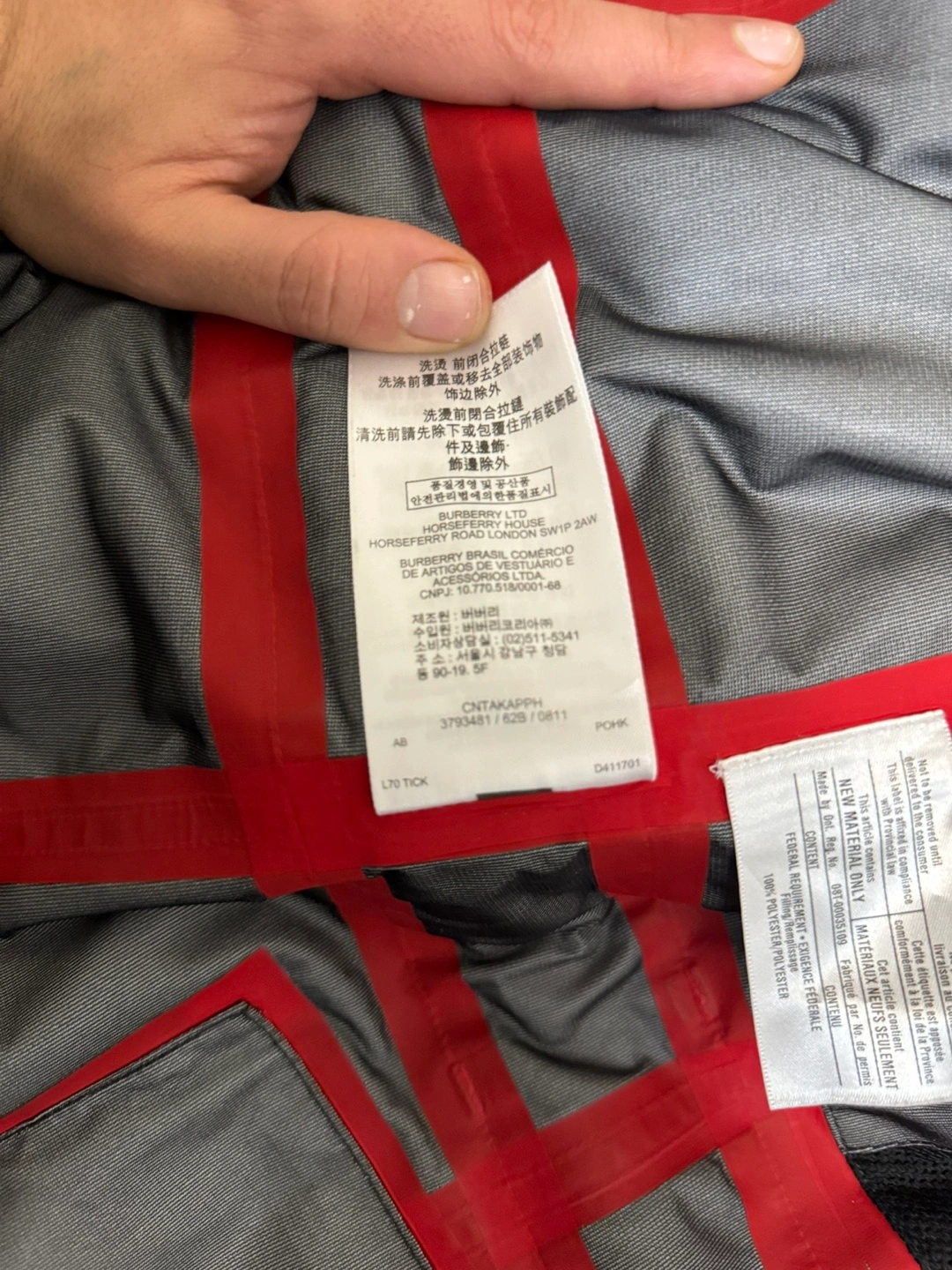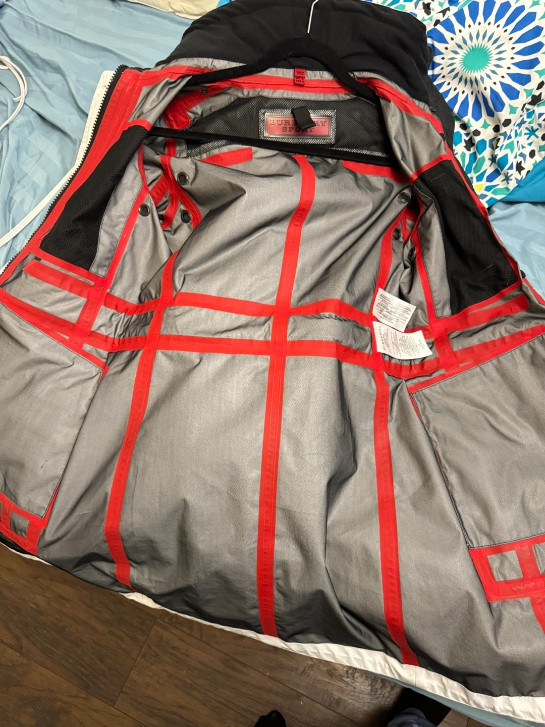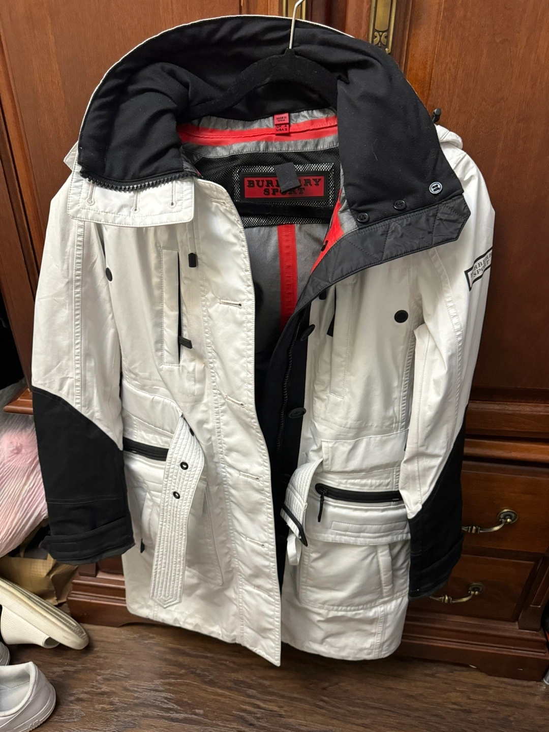 151Selling a Burberry Sport jacket in white with black accents. The size is a UK 4 / USA 2. The main fabric is 100% polyester.