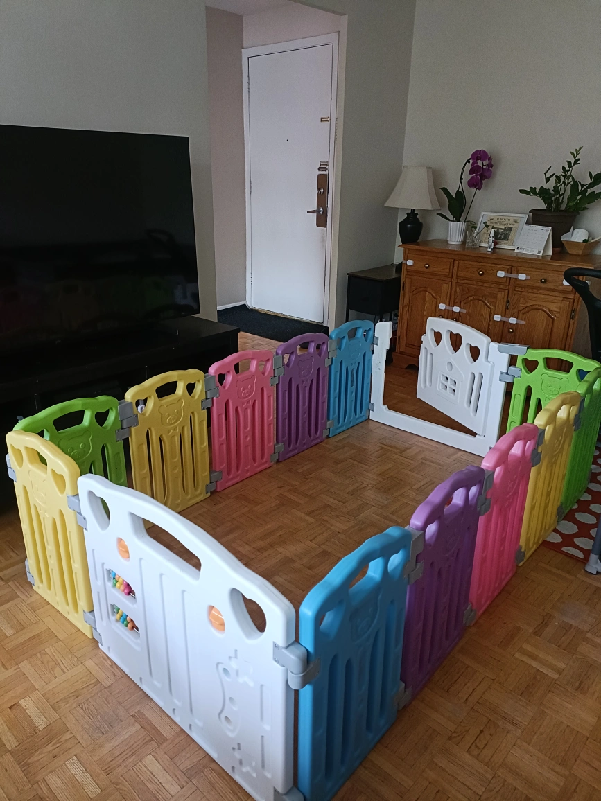 Selling a colourful baby playpen! It's in great condition and perfect for keeping your little one safe while they play. The playpen features a variety of colours and is easy to set up and take down.