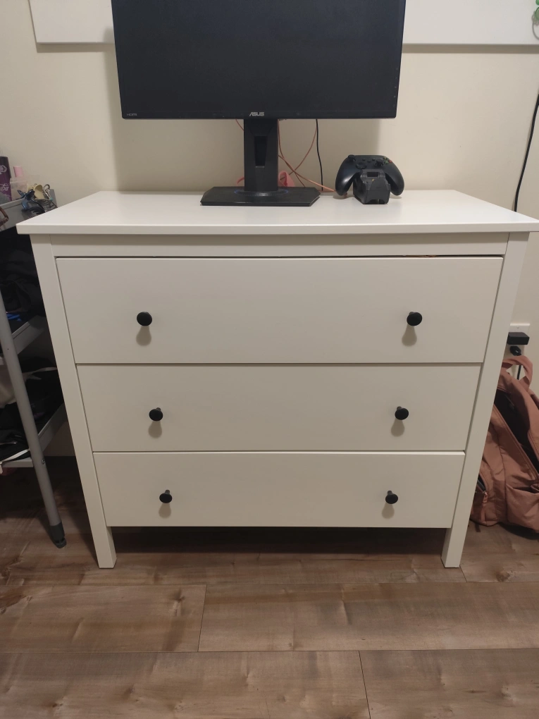 Selling a white dresser with three drawers! It's in great shape and ready for a new home. The dresser measures approximately 32 inches in height, 35 inches in width, and 18 inches in depth