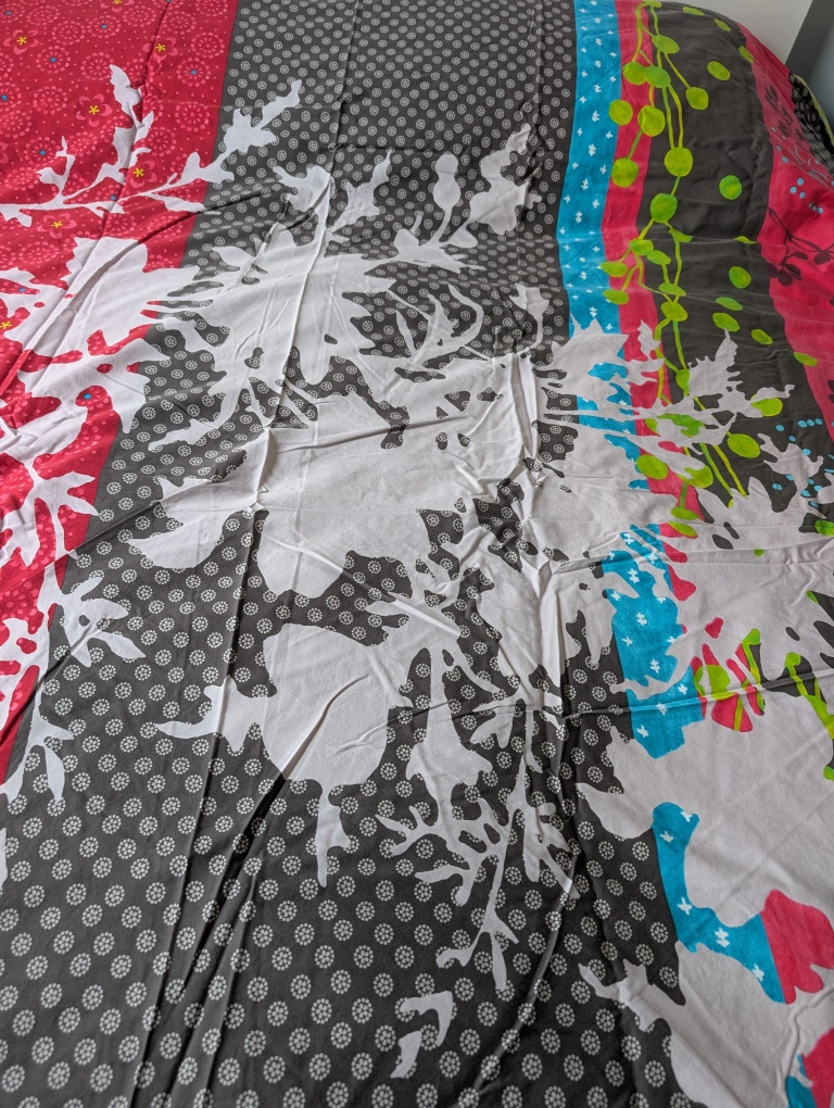 Colourful duvet cover with a unique pattern featuring a mix of floral and polka dot designs in red, grey, white, green, and blue. Perfect for adding a pop of colour to your bedroom.