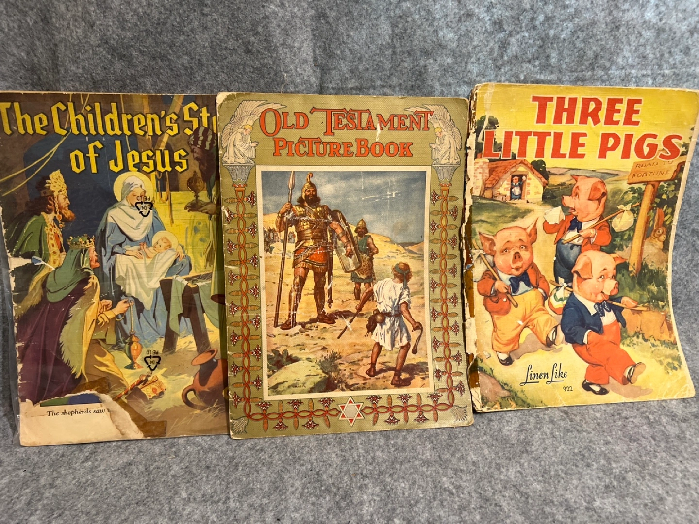 Selling a bundle of vintage children's books. Includes 'The Children's Story of Jesus', 'Old Testament Picture Book', and 'Three Little Pigs'. These books have a charming, classic feel!