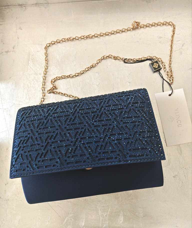 This Bonita evening clutch is perfect for a night out! It's a beautiful navy blue colour and comes with a gold chain strap. It's in excellent condition and ready for a new owner