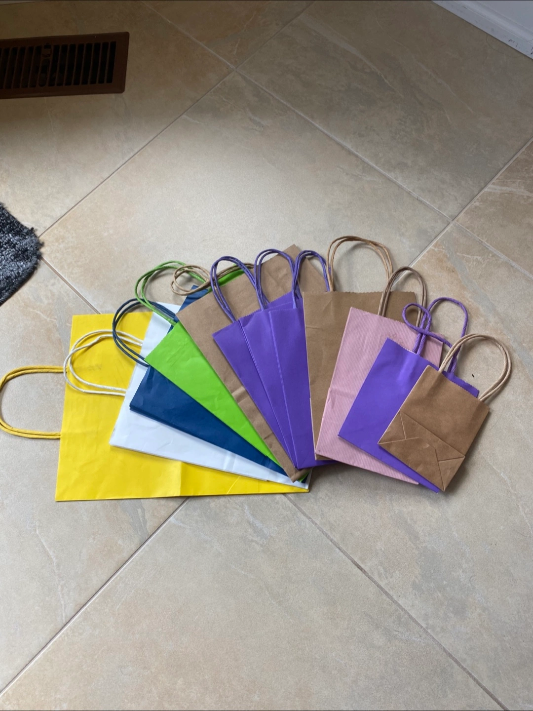 Selling 12 assorted sizes of gift bags in different colours! They're perfect for parties, small gifts, or even just organizing little things around the house.