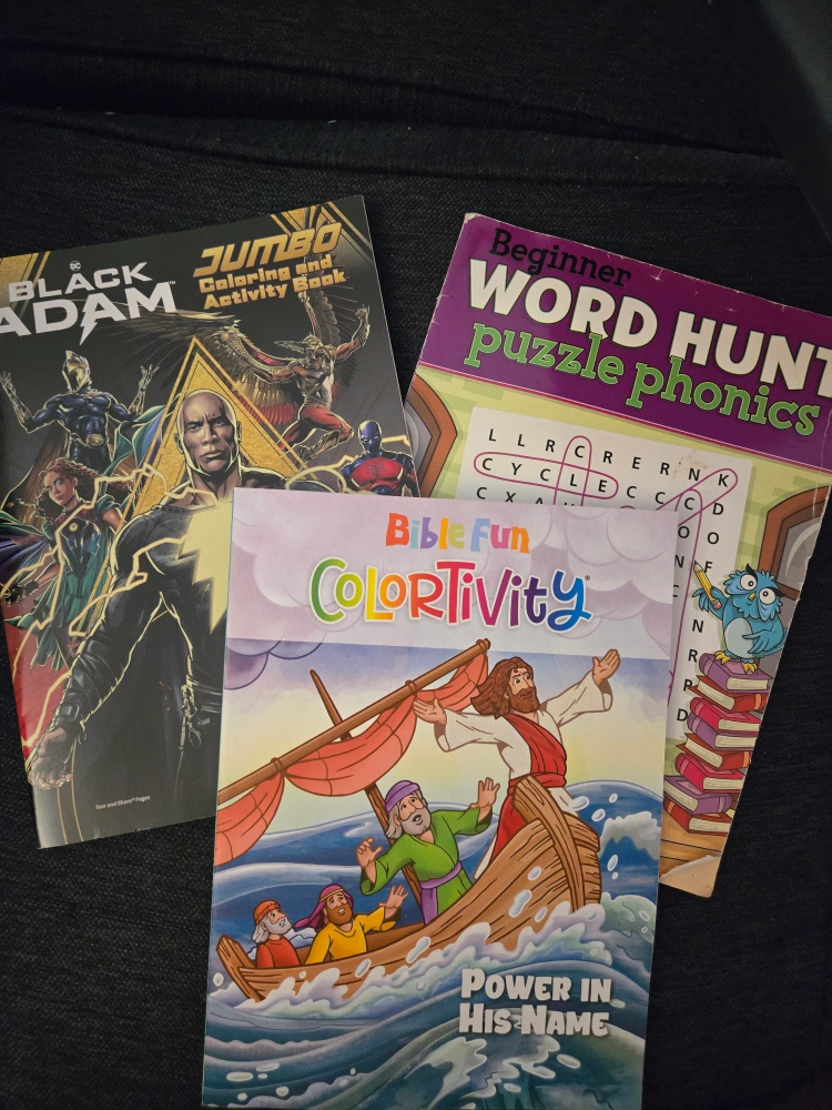 Selling a set of kids' activity books! Includes a Beginner Word Hunt puzzle phonics book, a Black Adam Jumbo coloring and activity book by Bendon, and a Bible Fun ColorTivity book