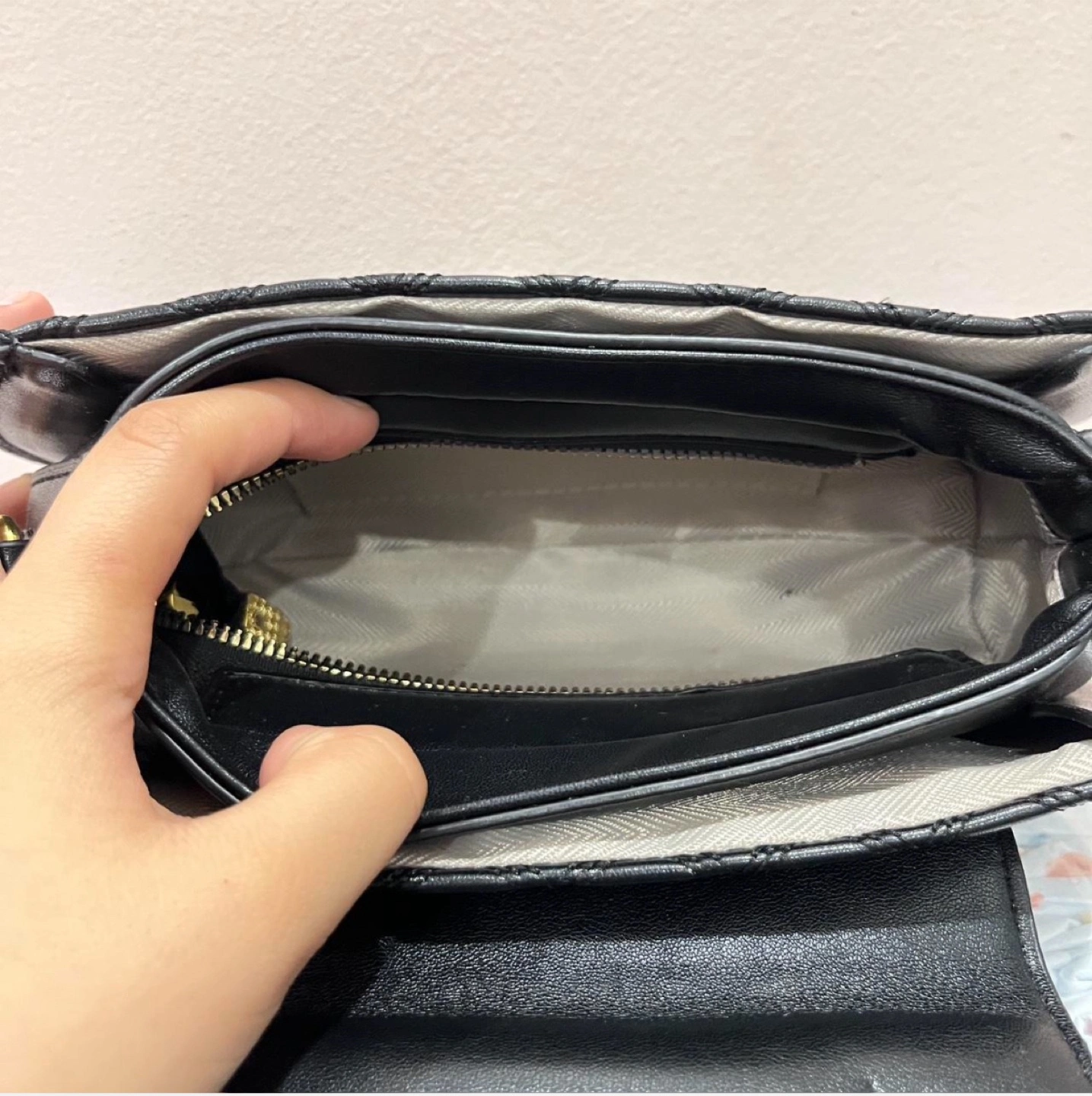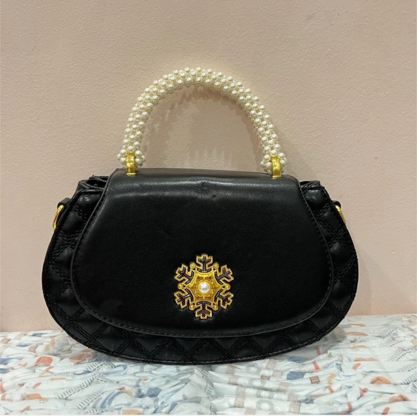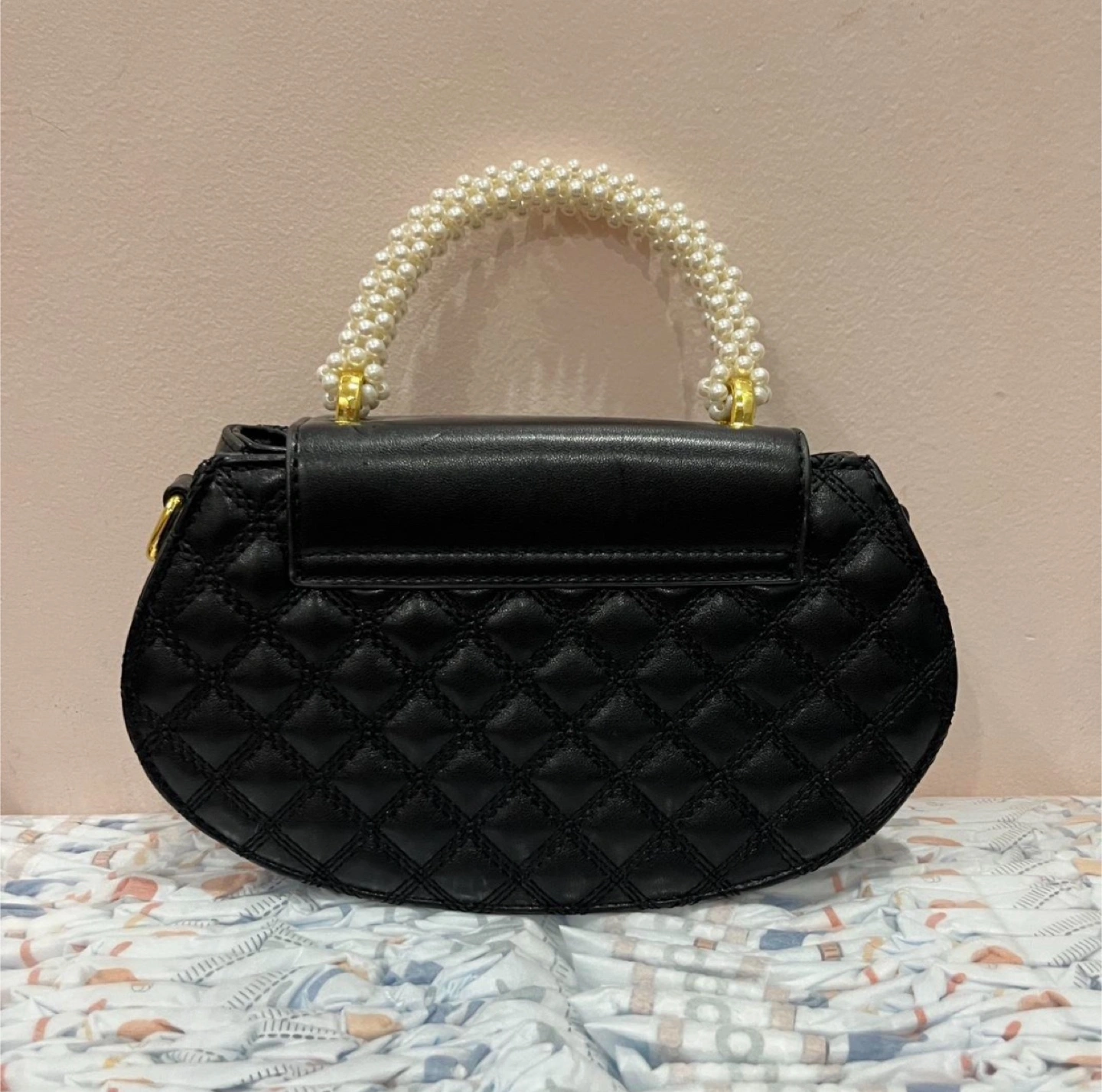 This is a stylish black quilted handbag with a unique pearl handle. It's perfect for adding a touch of elegance to any outfit. The bag features a secure zipper and a compact interior.