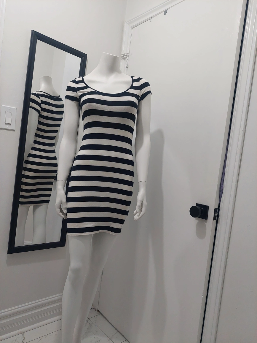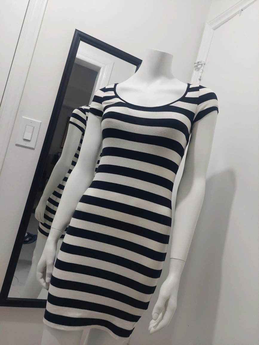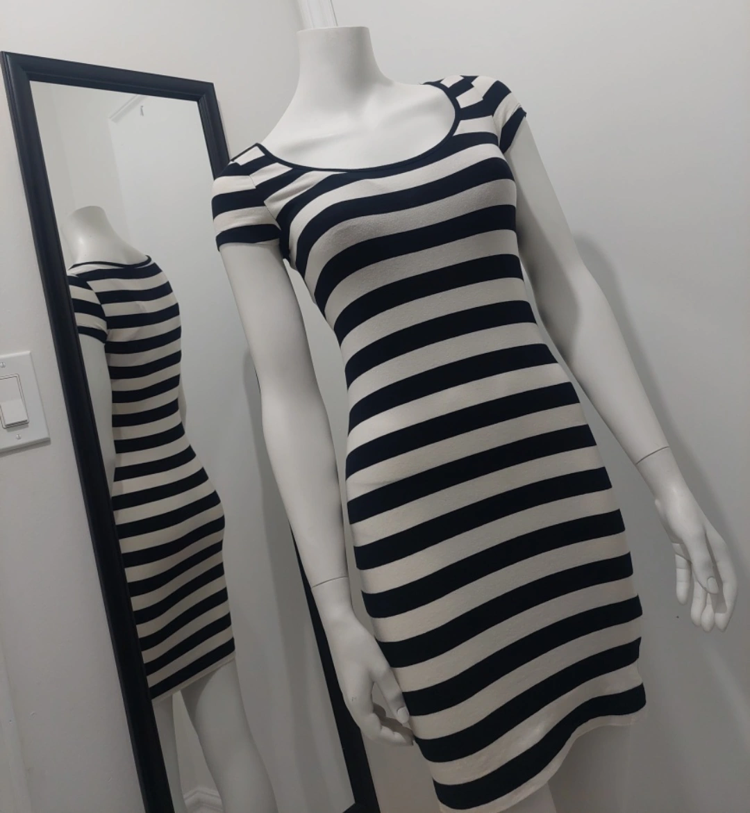 This is a cute striped bodycon dress! It features a classic black and white stripe pattern that's perfect for a casual or dressed-up look. The material is comfy and stretchy, making it a great fit. Add to bundling for additional discounts. Thank you for viewing my listjngs.