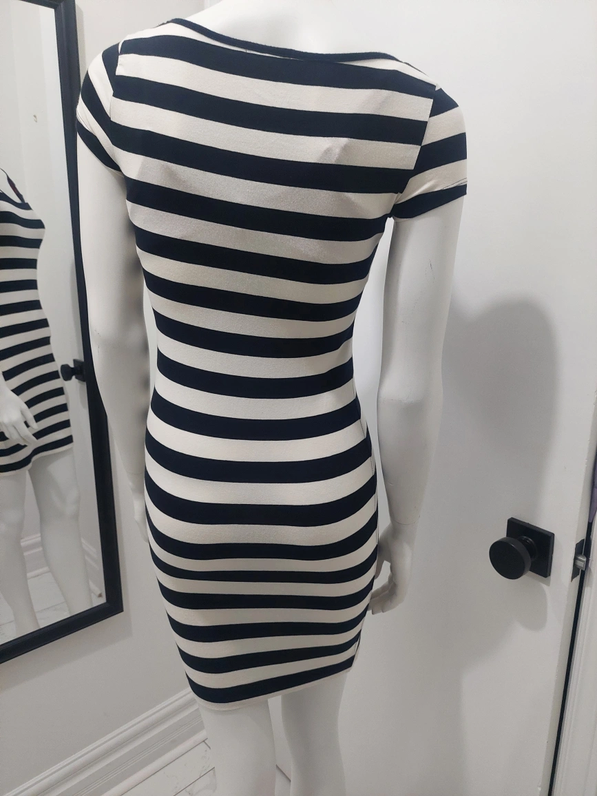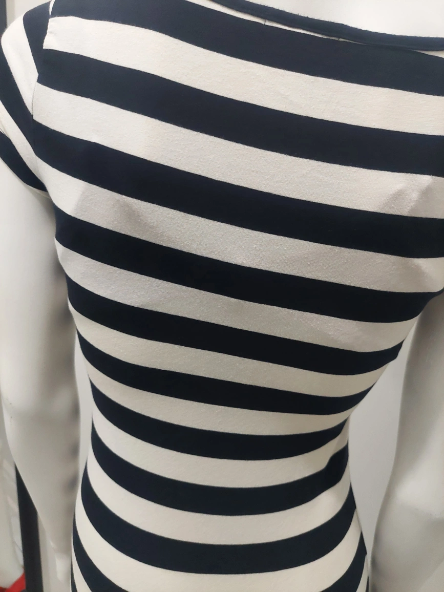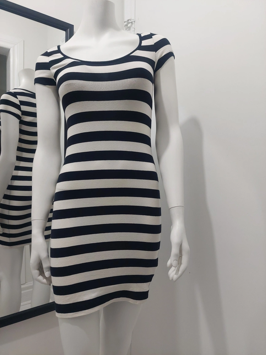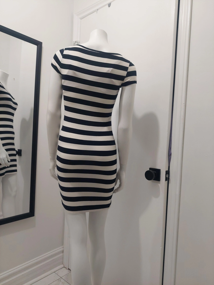 This is a cute striped bodycon dress! It features a classic black and white stripe pattern that's perfect for a casual or dressed-up look. The material is comfy and stretchy, making it a great fit. Add to bundling for additional discounts. Thank you for viewing my listjngs.
