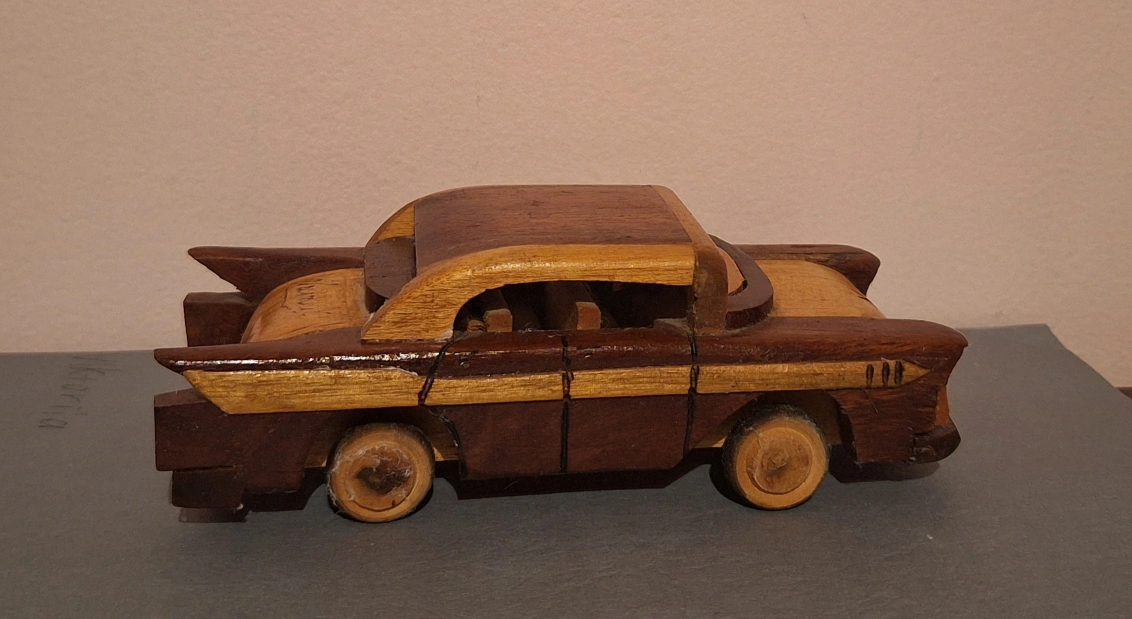 Here's a charming vintage wooden car. Classic design of 1957 Chevrolet Bel Air. It would be a great addition to any collection.