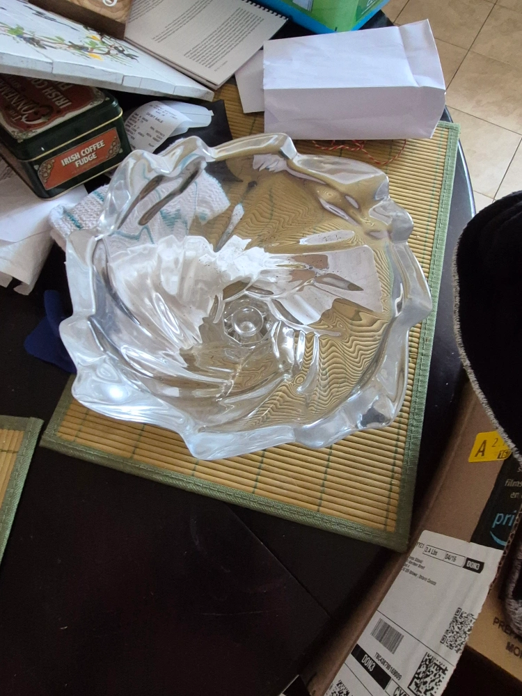 Selling a lovely clear glass pedestal bowl! It's in great shape and would look beautiful as a centerpiece or for serving snacks. The design is quite elegant and would add a touch of class to any table setting