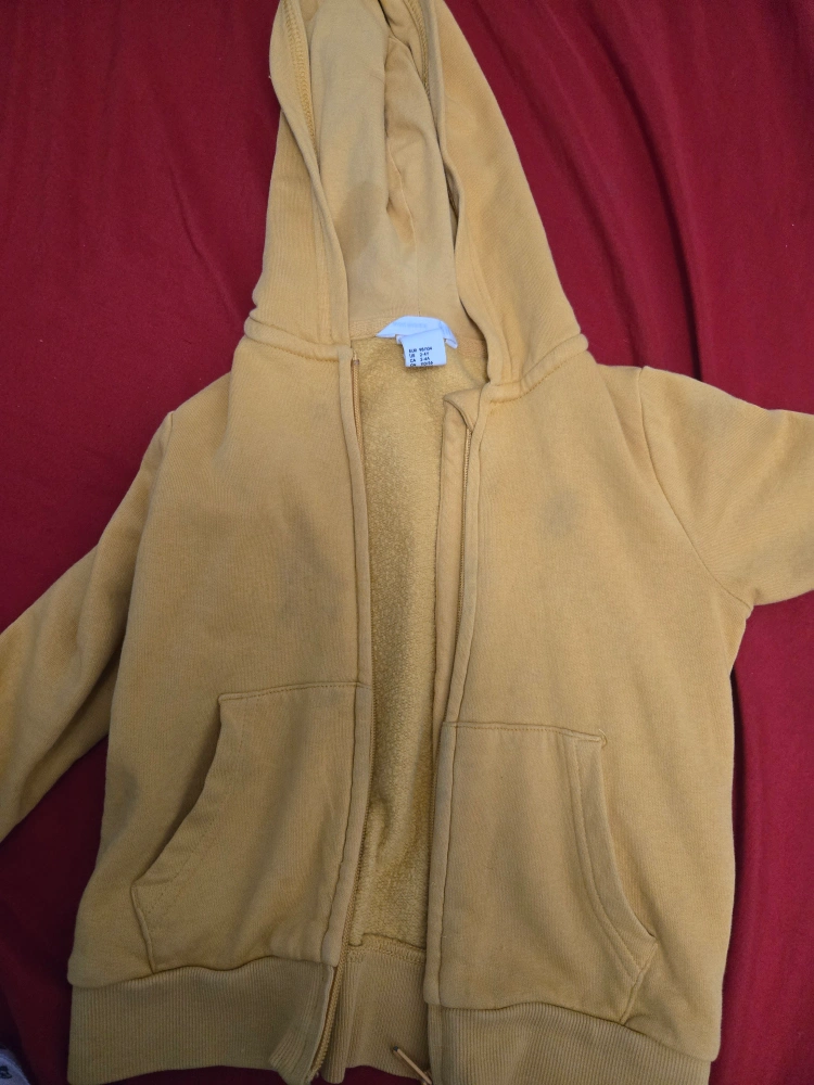 Selling a cute yellow zip-up hoodie from H&M. It's sized for kids aged 2-4 years. Perfect for layering or wearing on its own!