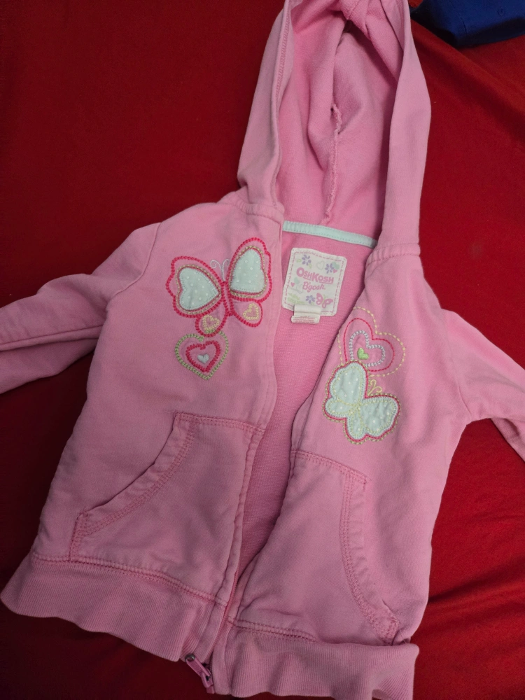 A cute pink hoodie from OshKosh B'gosh! It features adorable butterfly and heart designs embroidered on the front. Perfect for keeping your little one cozy and stylish.