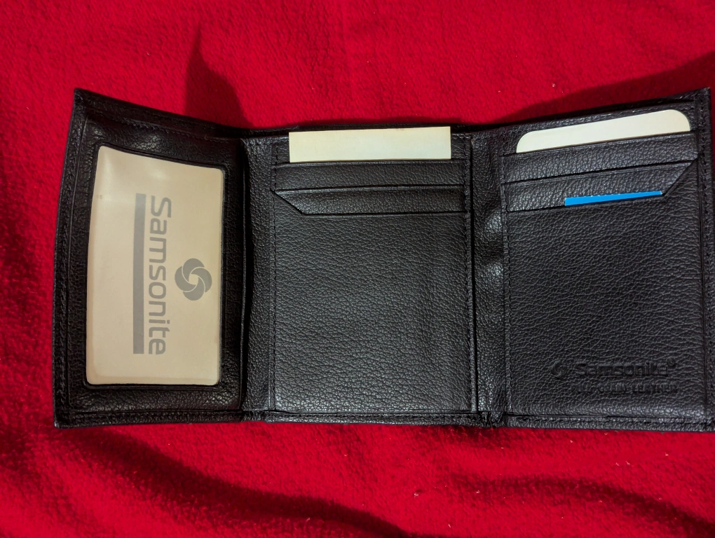 Selling a Samsonite tri-fold wallet in black leather! It's in great shape and ready for a new home. Perfect for keeping your cards and cash organized.