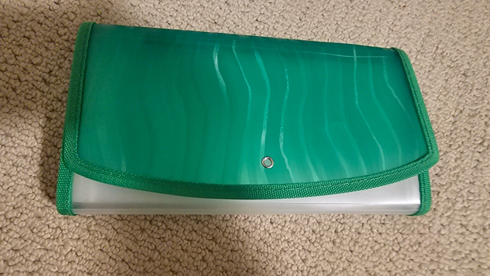 Here's a green expanding file folder for keeping your documents organized! It's in great shape and ready to help you sort your papers. Lost rubber band.