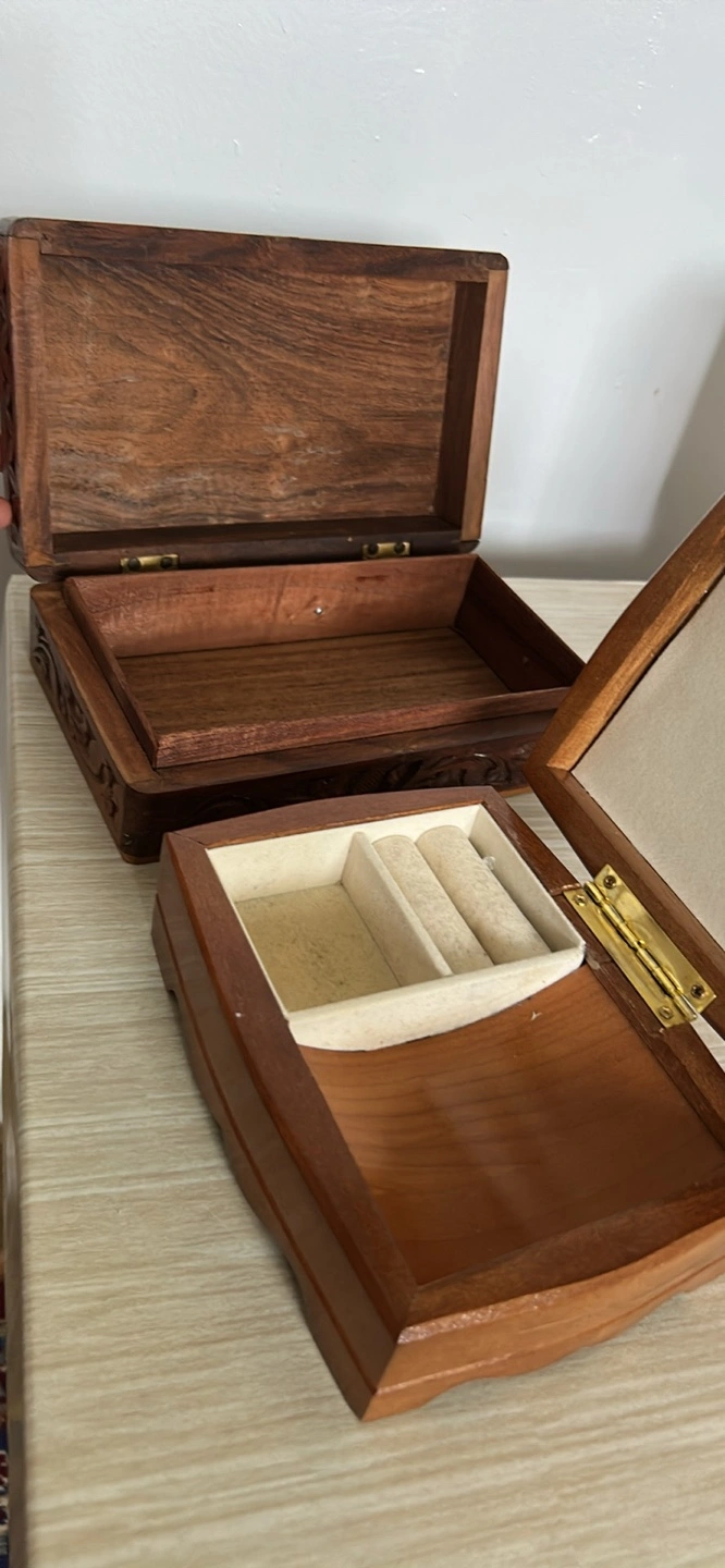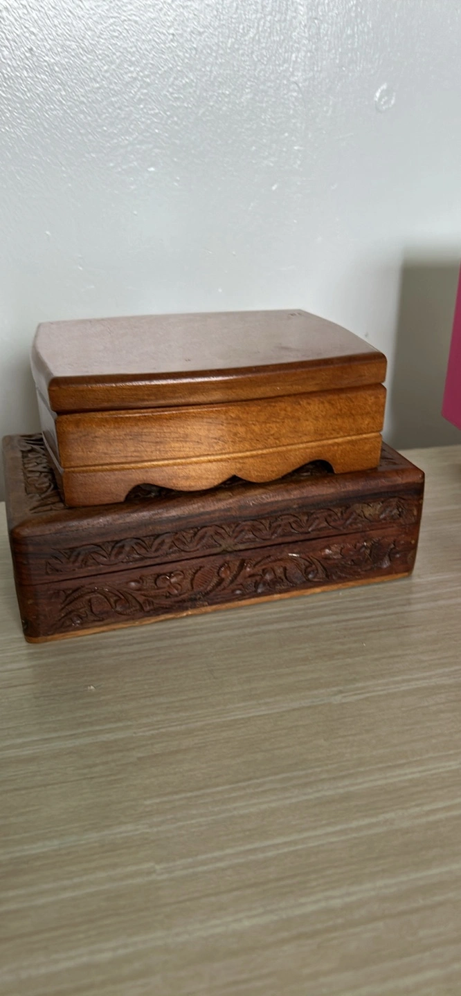 181Selling a set of two wooden jewelry boxes. The larger one has beautiful carved details, and the smaller one is simple and elegant. Perfect for storing your precious items!