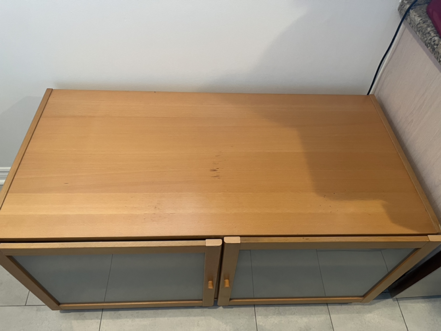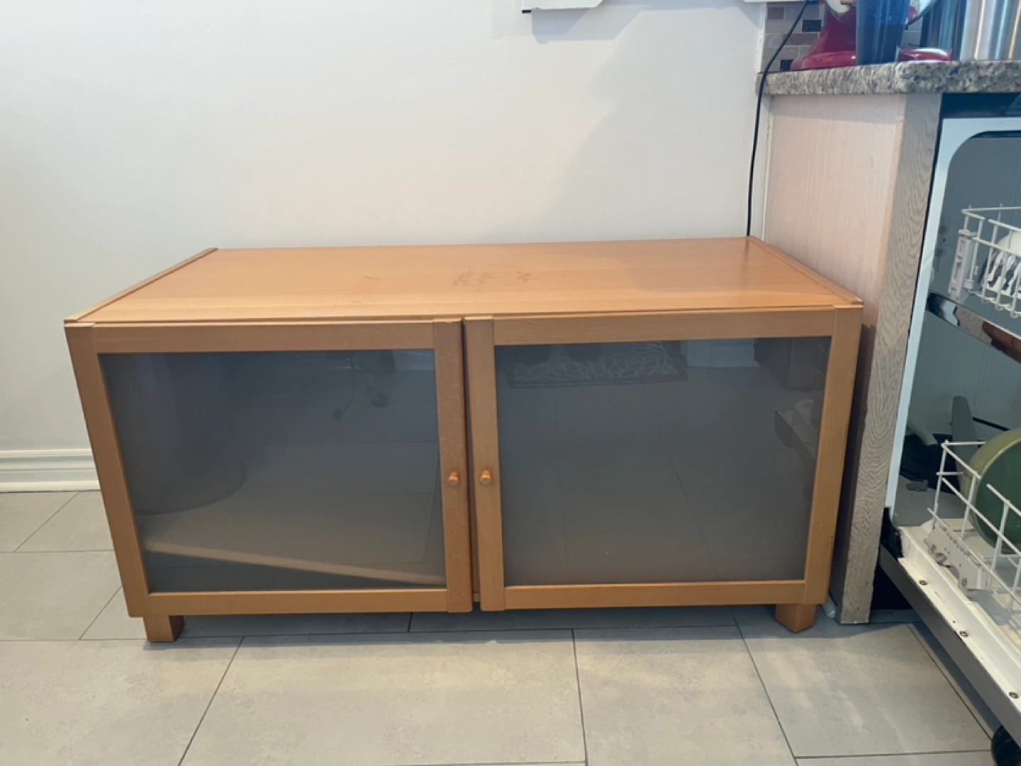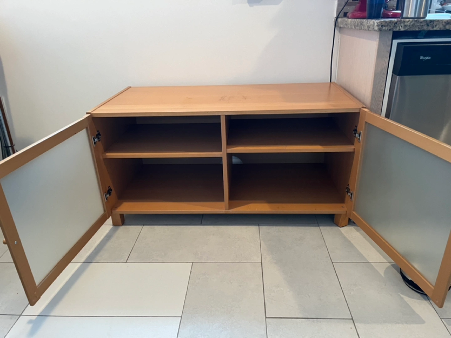 Used IKEA TV stand with storage. Shelf heights are adjustable. The top of the stand has some marks on it (shown in photos)