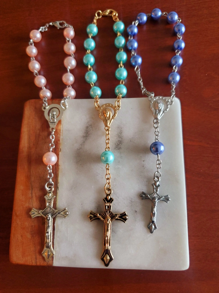 handmade rosary beads. They come in pink, turquoise, and blue pearl colours. Each rosary features a unique metal crucifix. Perfect for prayer or as a decorative item! $18.00 each